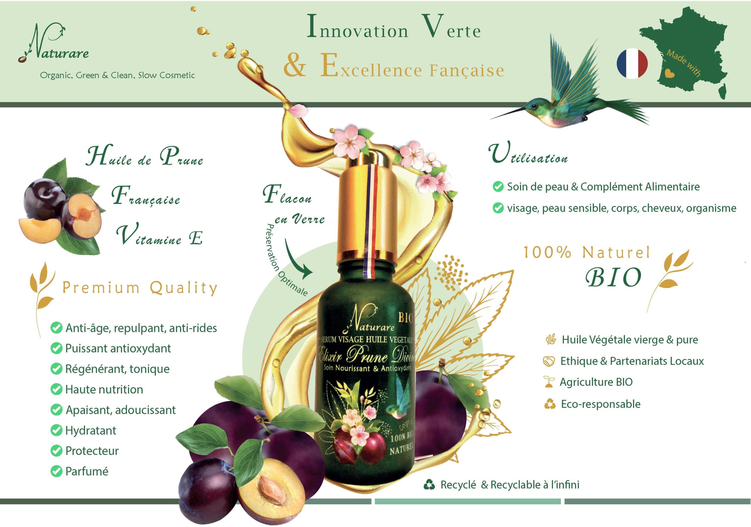 Une huile unique au monde issue d’une innovation verte, d’une idée de recyclage des noyaux d’amandons de prunes inutilisés. Un véritable cercle vertueux économie circulaire en exploitant les noyaux des prunes d’Ente, utilisées pour la production des pruneaux d’Agen. Leurs amandons étaient considérés jusqu’alors comme des déchets par l’industrie et leur destruction constituait un coût non négligeable. Une parfaite revalorisation vertueuse des déchets en huile d’exception aux multiples bienfaits avec un impact environnemental indéniable. Cela permet de réduire les déchets tout en créant de la valeur.