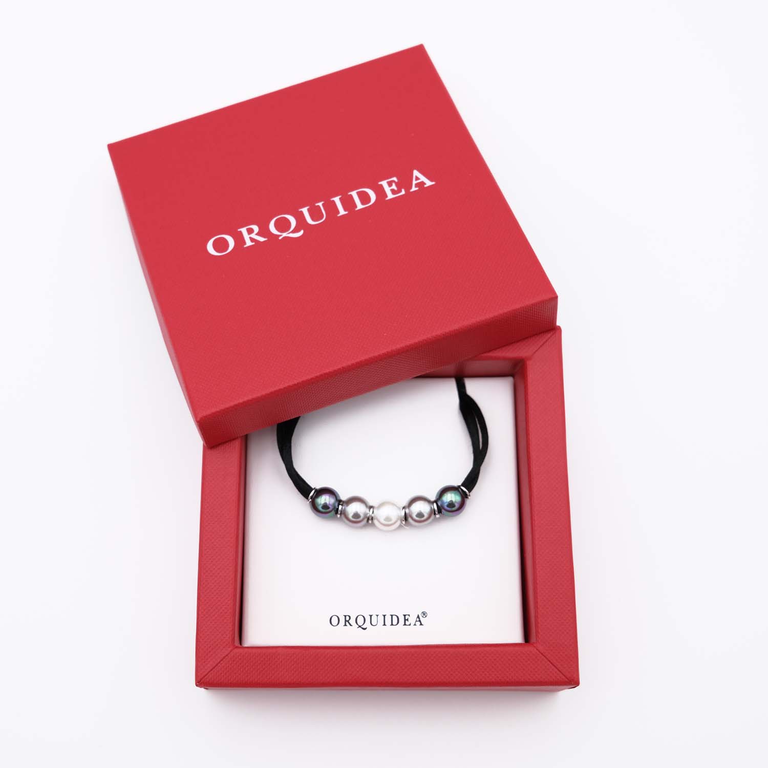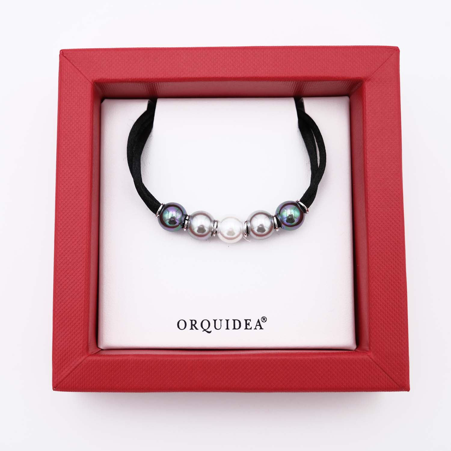 Bracelet en perles et argent 925 rhodié de la marque Orquidéa. Il se compose de 5 perles de Majorque de 10 mm et d’un cordon noir en soie. Élégant et raffiné, ce bijou d’une longueur de 19 cm sublimera votre poignet en toutes occasions.