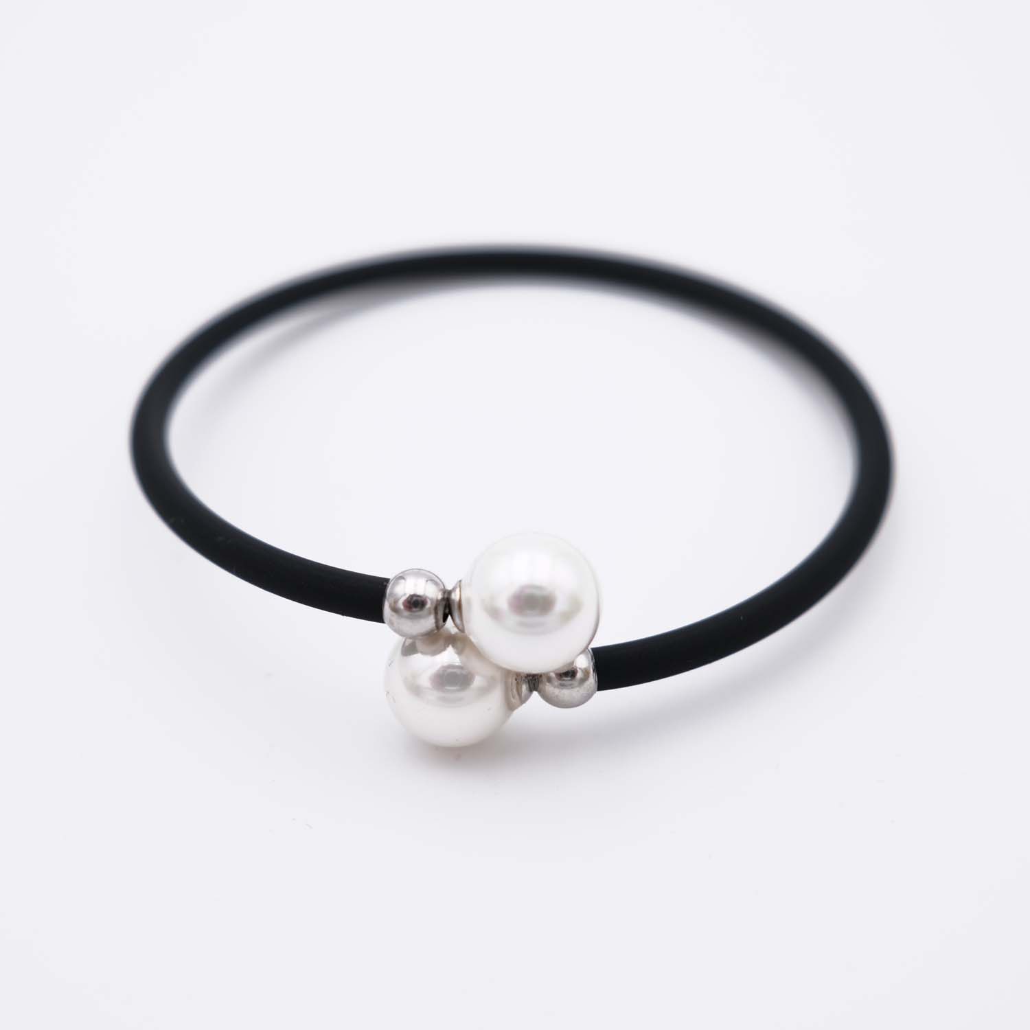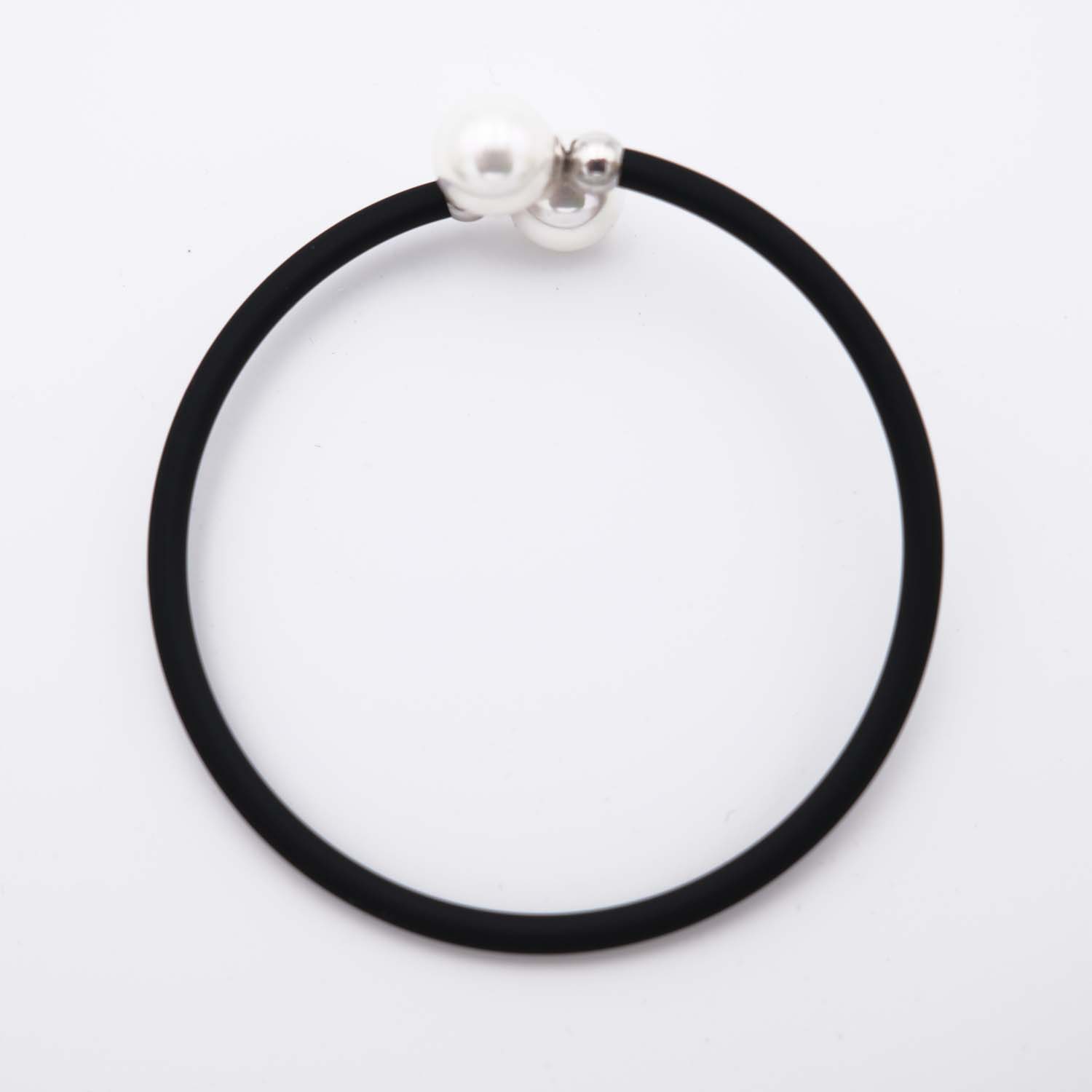 Ce bracelet en perles de Majorque est constitué de perles de 8 millimètres. Ces dernières sont reliées à l’aide d’un délicat cordon en caoutchouc avec un noyau en acier. Il s’agit tout simplement d’acier enduit d’une petite couche de rhodium, qui sert à préserver l’éclat du métal précieux.
