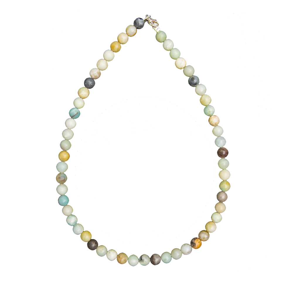 - Le collier amazonite multicolore en pierres boules de 8mm correspond aux chakras de la Gorge et du Cœur.