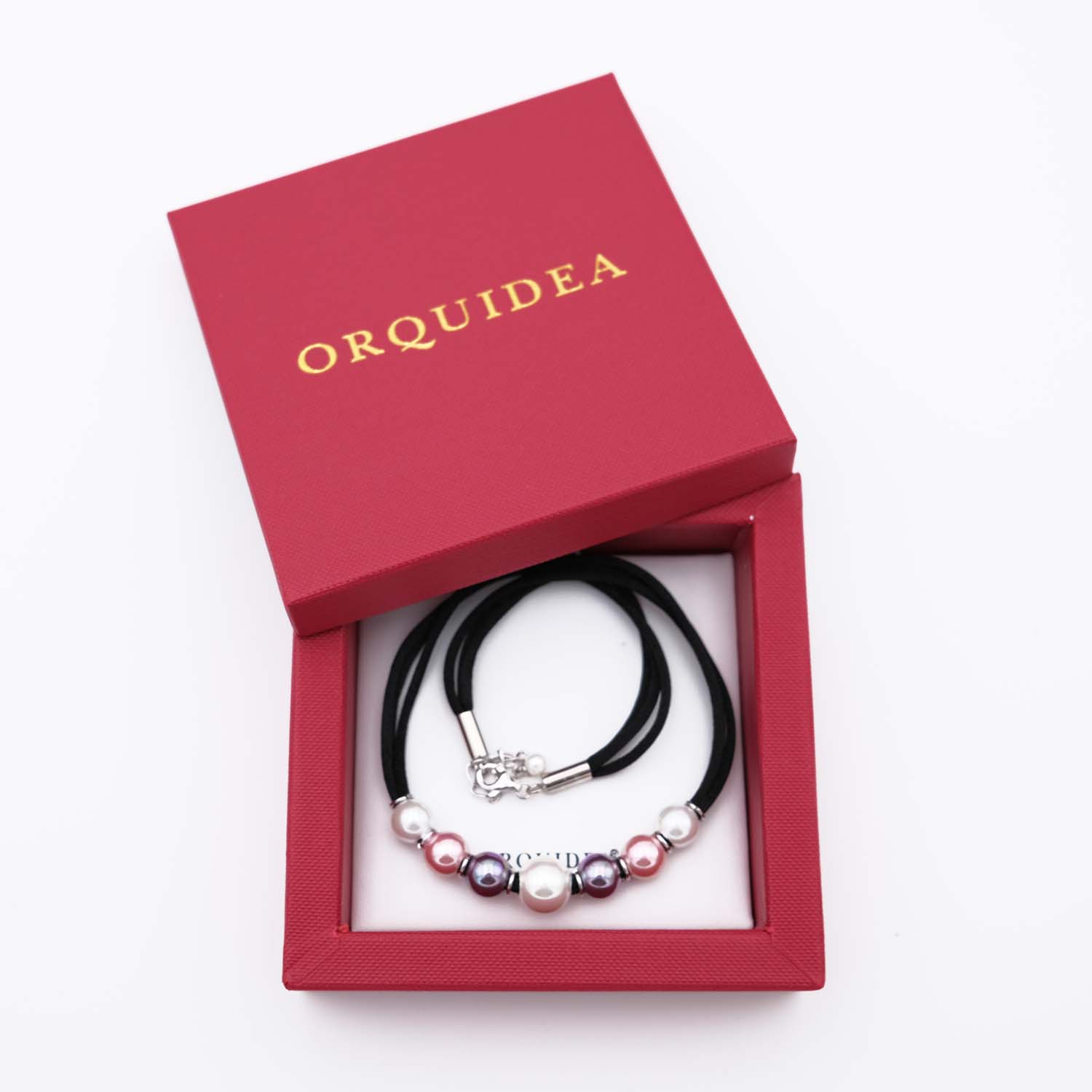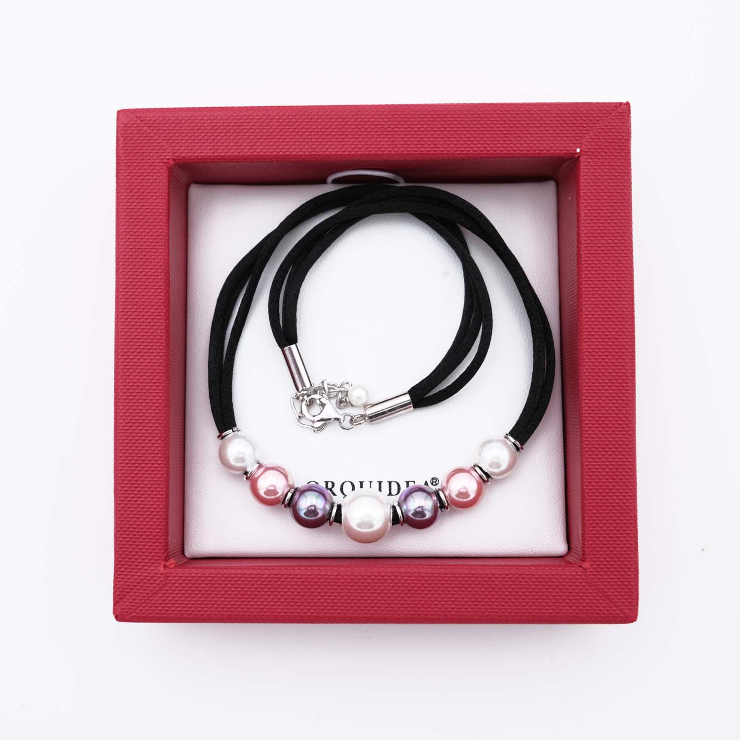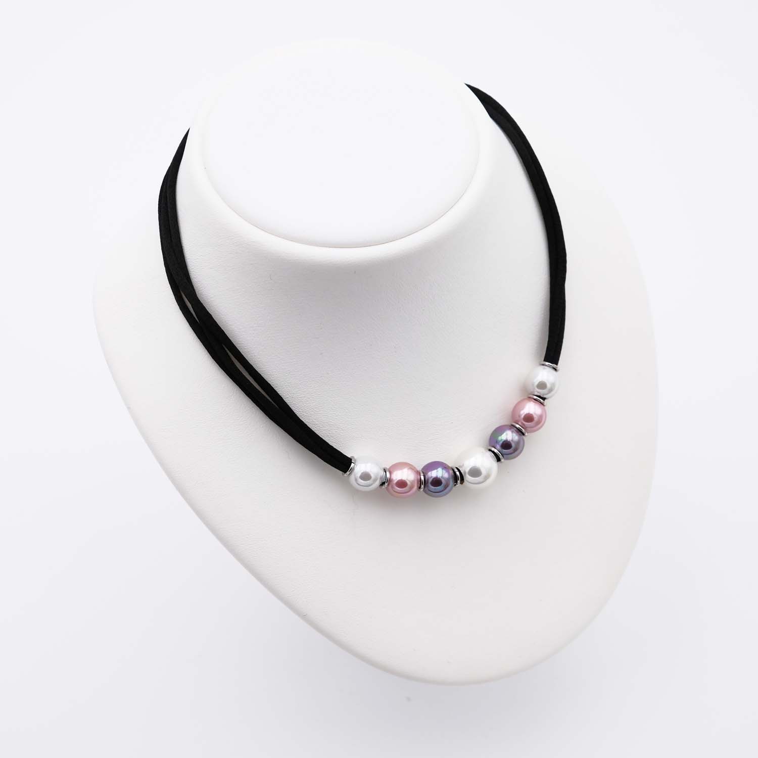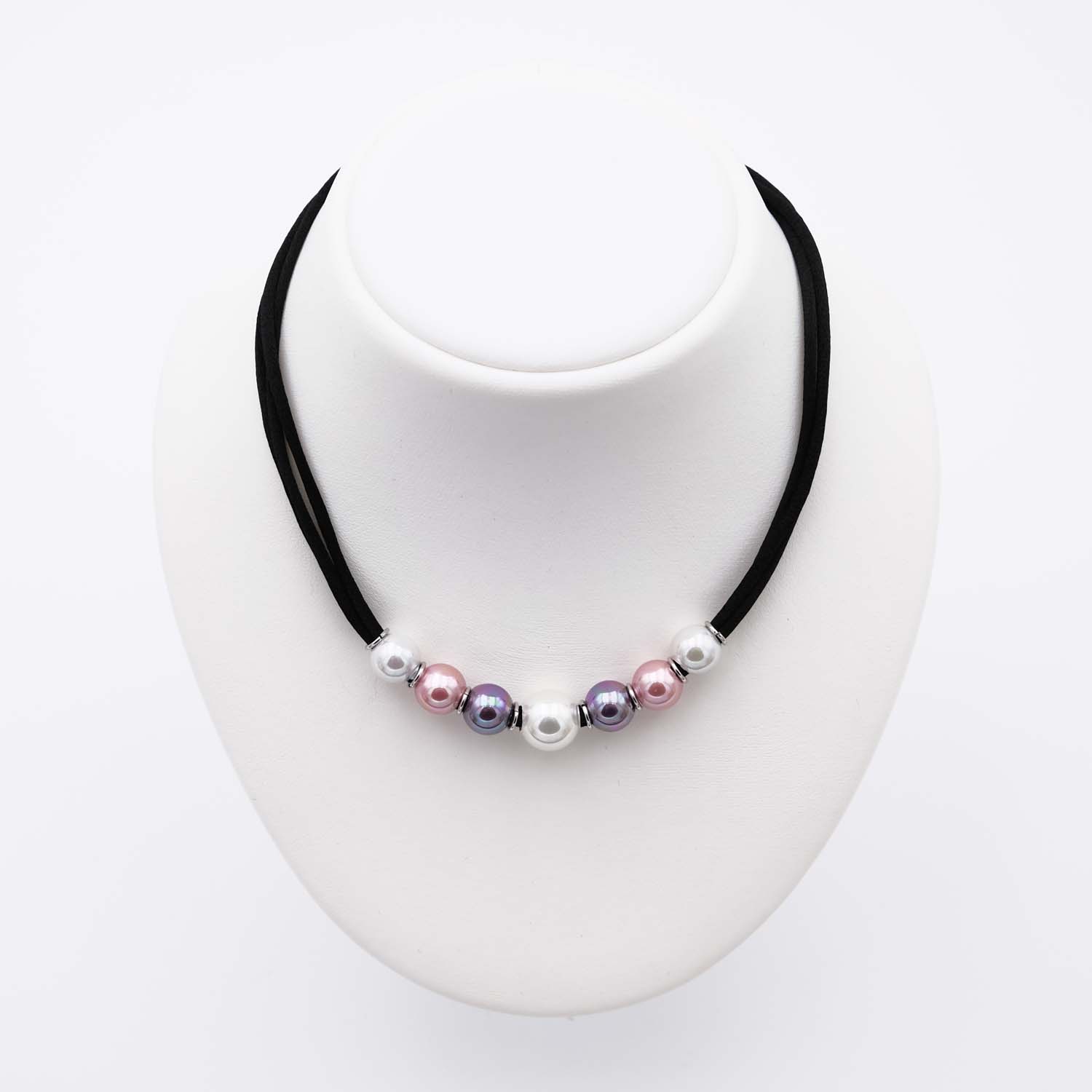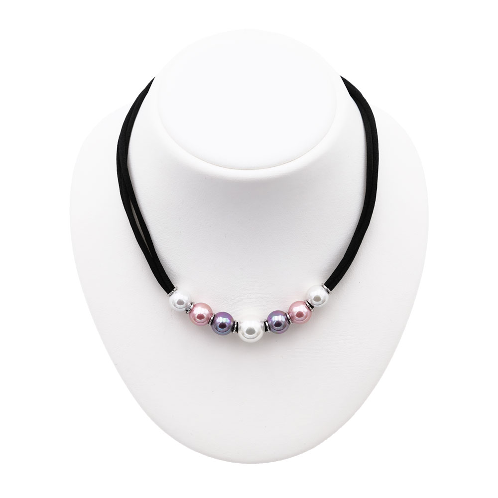 Plein de douceur pour ce collier en perles de Majorque. En effet, les couleurs douces des perles associées au cordon de soie promettent un bijou très tendre à porter autour du cou directement sur la peau. Le collier en perles est composé de sept perles. Une perle principale de 12 mm de diamètre de couleur blanche est au centre du collier en perles. Autour de ce joyau, six perles de 10 mm de diamètre sont disposées de manière symétrique. Six perles blanches, rose et violette entourent et mettent en valeur la plus grosse perle. L’ensemble procure un caractère doux et harmonieux au collier en perles de Majorque. De plus, le contraste de la soie noire avec les perles pastel rehausse l’éclat et la brillance des perles.