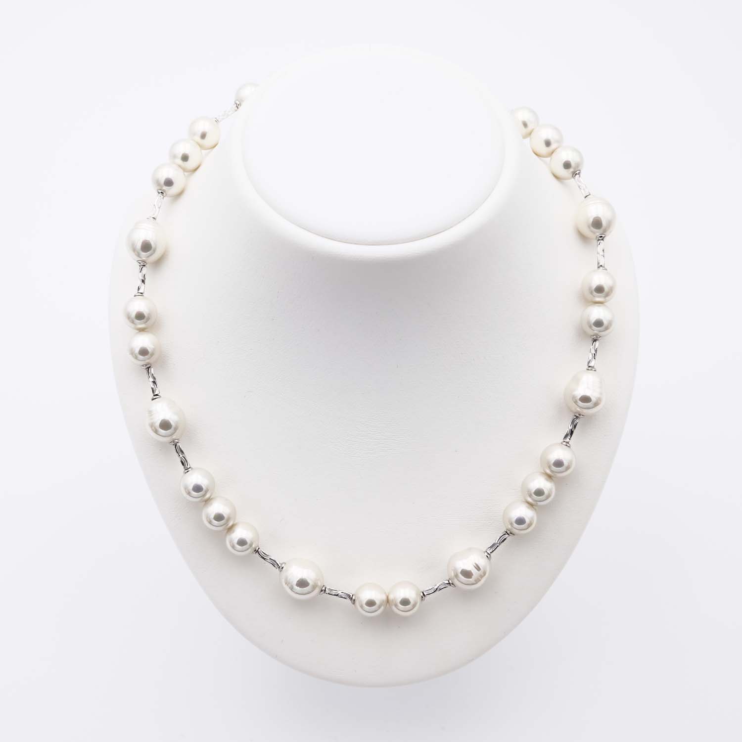 La structure du collier en perles est tout à fait symétrique. Autour de deux perles de diamètre identique sont disposées des perles de Majorque par une, deux ou trois perles. Les perles sont toutes de la même couleur, blanc nacré, mais leurs formes divergent. Les perles sont parfaitement rondes ou baroques. L’ensemble du collier en perles est savamment organisé et cet ordre procure une harmonie au bijou. De fins cylindres en argent strié séparent les groupements de perles. Argent et blancheur nacré garantissent élégance et raffinement au collier en perles. Ce bijou est à la fois lumineux et discret.