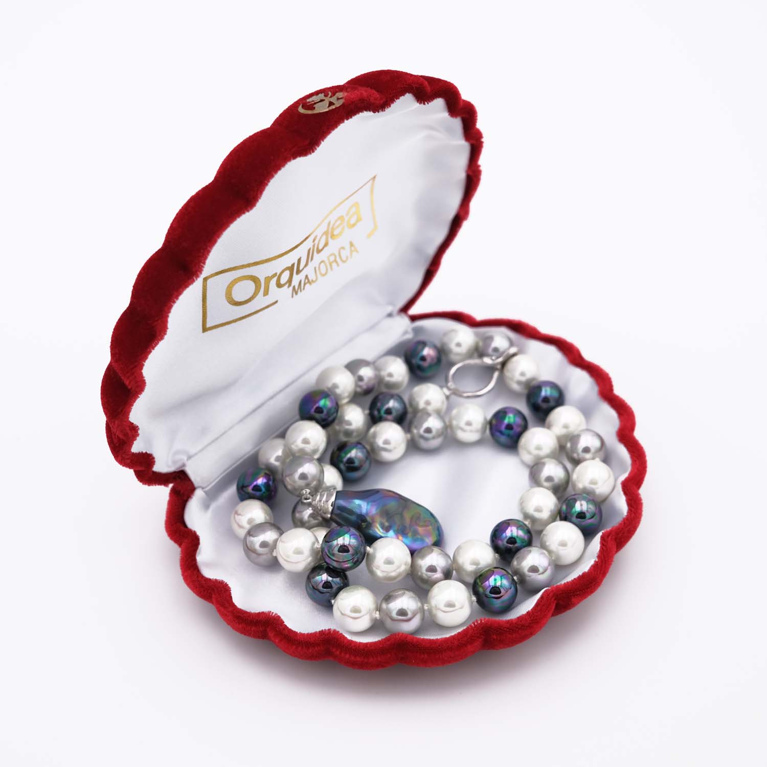 Notre collier en perles de Majorque est composée de perles d’un diamètre de 12 mm avec une jolie harmonie de trois couleurs : blanches, grises et pétroles.