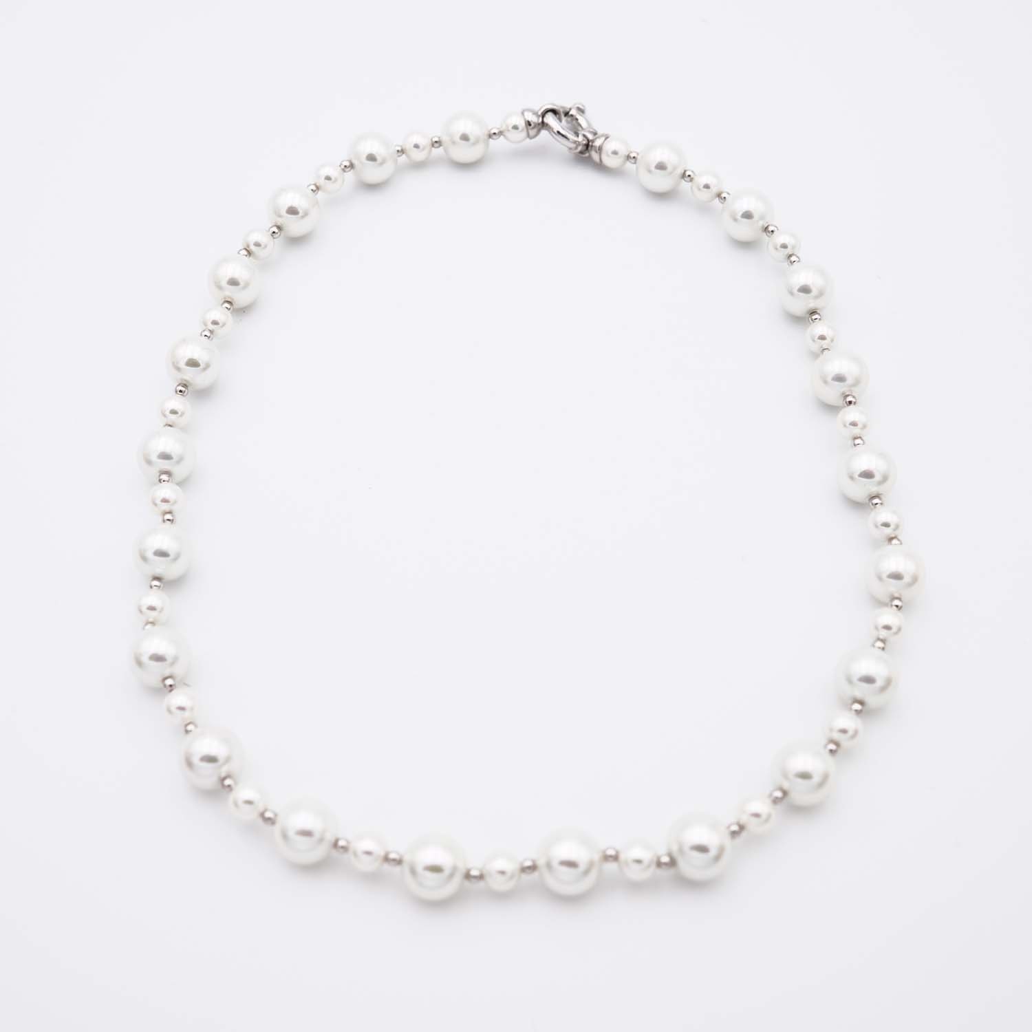 Ce collier est fait de perles de Majorque blanches et d’argent 925. Il offre un contraste doux sur la peau et donne un rendu soigné, discret et élégant. Les perles de Majorque possède une apparence laiteuse et sont considérées comme de très belles pierres en joaillerie, d’où leur popularité.