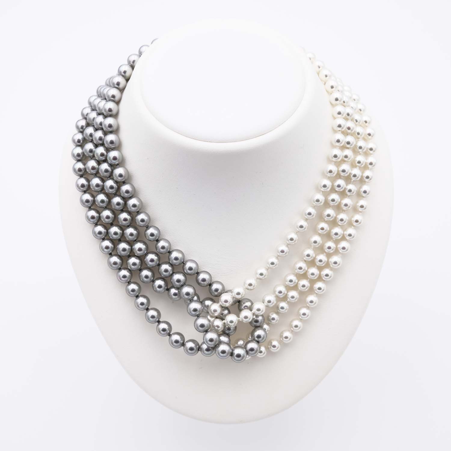 Ce superbe collier en perles est un bijou unique d’une grande beauté. Bicolore, il est conçu avec des perles blanches et des perles foncées. Le collier en perles de Majorque se compose de plusieurs rangs de perles entremêlés. Les perles sont parfaitement rondes. La différence de taille entre les perles blanches et les perles foncées est à peine perceptible à l’œil nu. Les perles blanches ont un diamètre de 6 mm et les perles foncées ont un diamètre de 7 mm. Ce léger décalage apporte sa particularité au collier en perles de Majorque et lui donne un charme fou. Ce collier en perles se porte ras du cou.