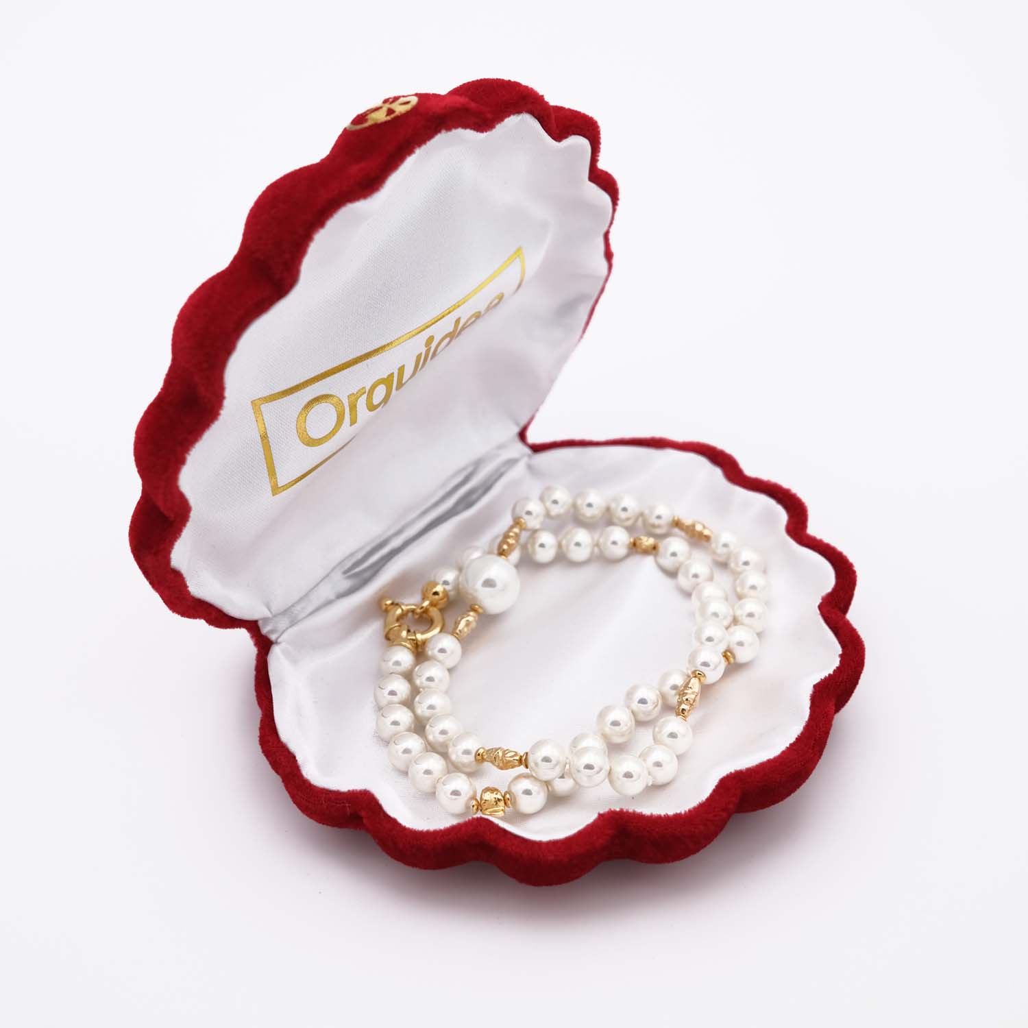 C’est le collier de perles dans toute sa splendeur, tel qu’on se l’imagine et tel qu’il apparaît dans l’imaginaire collectif. Ce bijou représente le collier en perles des princesses. Les perles sont mises en valeur dans un alignement parfaitement régulier. Les perles sont blanches et uniformément rondes. Leur diamètre varie de 7 à 12 mm. La plus grosse perle se situe à l’avant, en un seul exemplaire, alors que les plus petites perles sont à l’arrière du bijou. Ce collier en perles de Majorque associe l’or et les perles blanches. L’or rajoute au précieux du collier en perles et à sa haute valeur symbolique.