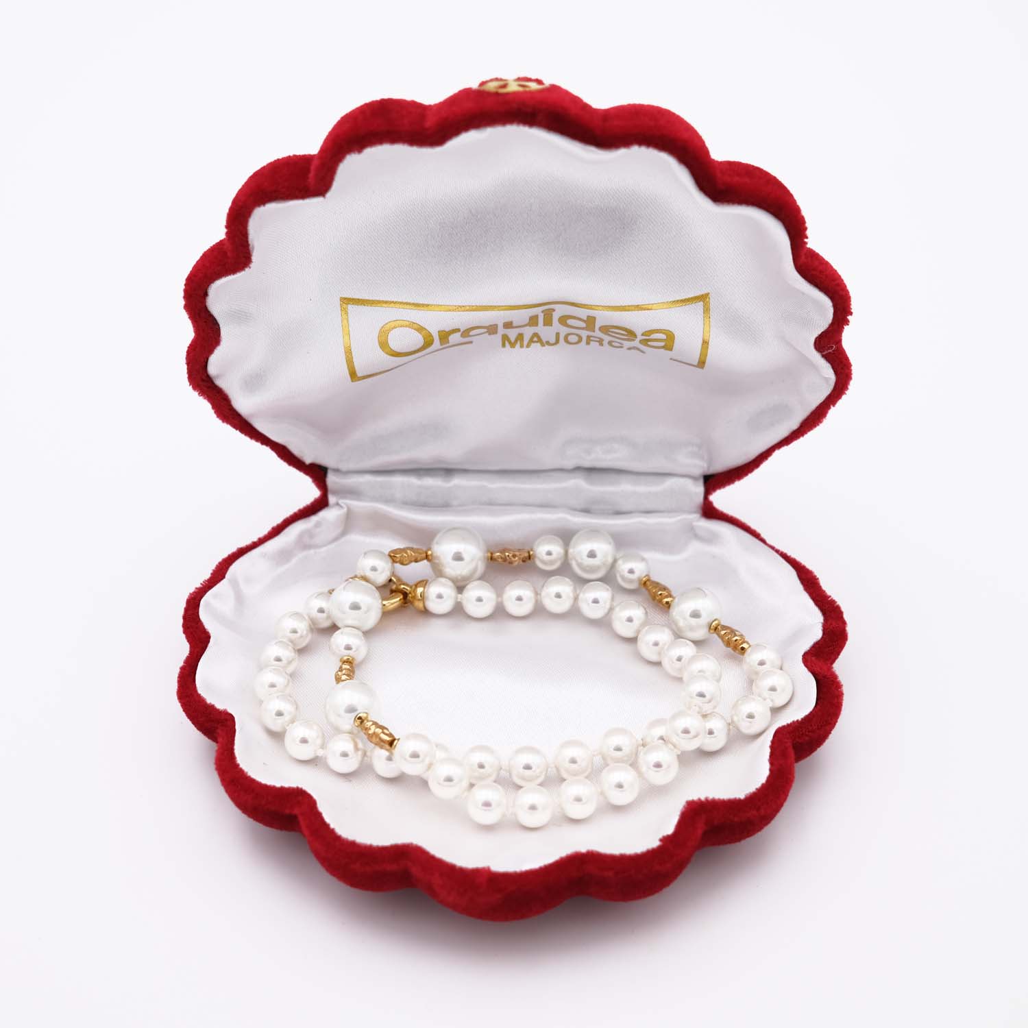 Ce magnifique collier en perles de Majorque est long de 45 centimètres. Il comporte plusieurs perles de 7 et 12 millimètres. Sa longueur lui permet de convenir à tous les tours de cou. Le contraste saisissant entre l’or et le blanc lustré des perles magnifie tous les teints de peau. Votre visage paraît plus beau quand vous portez ce collier en perles, une véritable merveille de la nature.