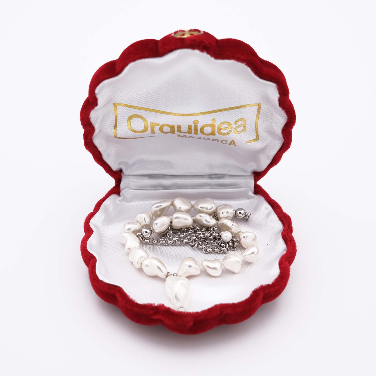 Si la perle de Majorque est traditionnellement ronde, c’est qu’elle hérite d’une technique de fabrication unique. En effet, en 1890 les artisans de l’île de Majorque tentent de reproduire artificiellement le rendu des perles d’huitres en plongeant des billes de verre dans un bain nacré. C’est de cette technique que naît la perle de Majorque. Aujourd’hui, il est désormais possible d’obtenir des silhouettes de perles différentes, laissant entrevoir un répertoire formel aussi riche que varié, séduisant de plus en plus de bijoutiers contemporains.