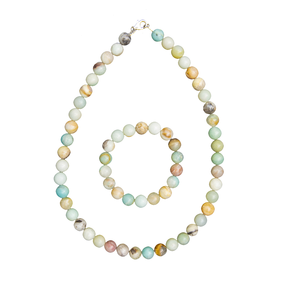 Parure composée du bracelet et du collier en amazonite multicolore en pierres boules de 10mm