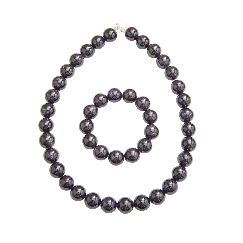 Parure composée du bracelet et du collier en améthyste en pierres boules de 14mm