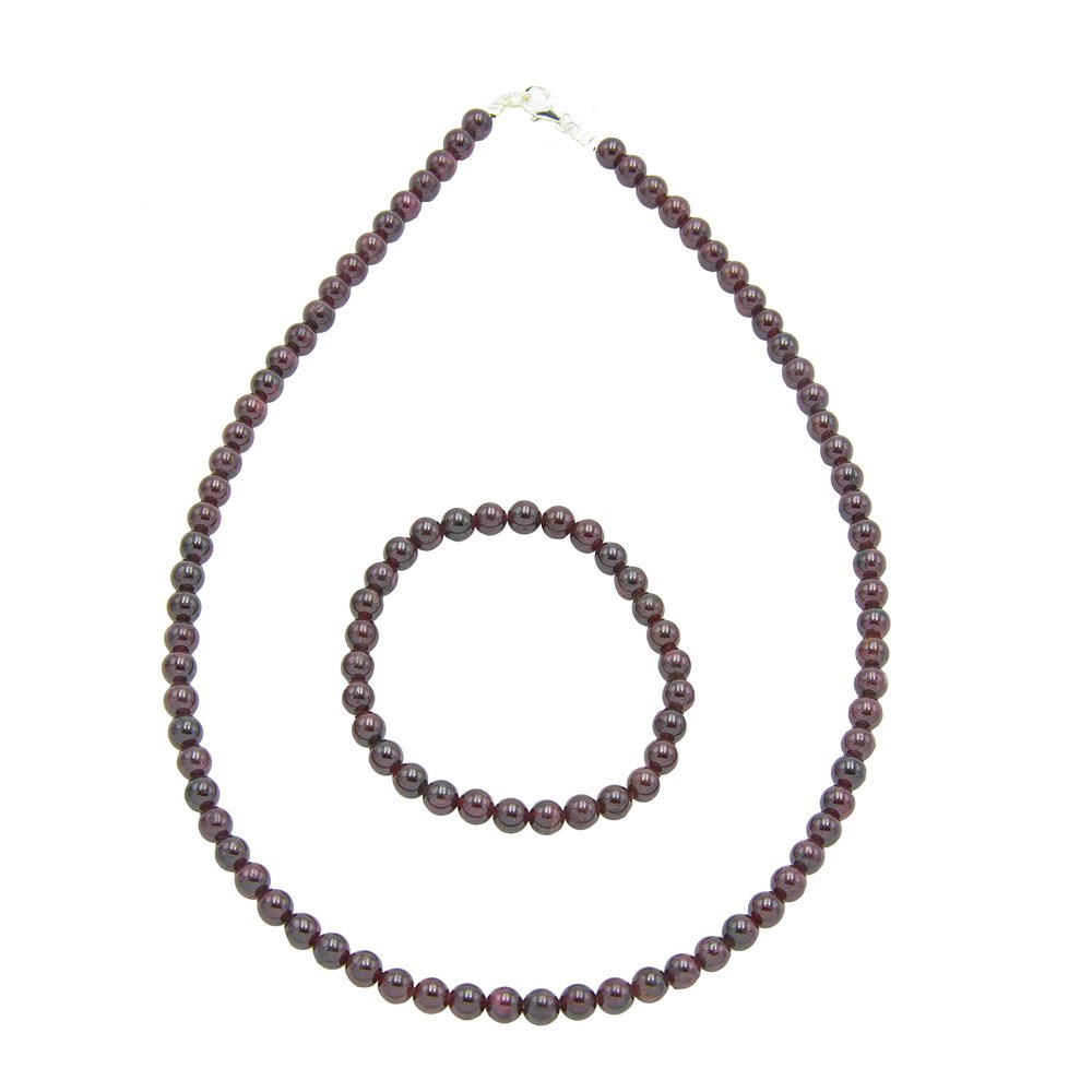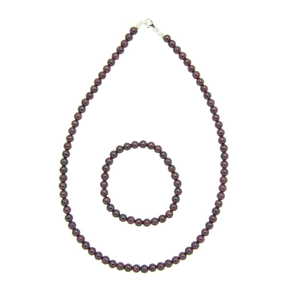 La parure grenat en pierres boules de 6mm se compose de deux magnifiques bijoux, un collier et un bracelet, en grenat. Le grenat est une pierre utilisée depuis des millénaires en joaillerie. Son nom fait référence à la grenade, le fruit rouge sombre dont il arbore la couleur. Dans l’Antiquité, en Egypte, en Grèce et à Rome, il était sculpté en forme d’animal ou d’humain et constituait des amulettes protectrices. Au Moyen-Âge, il représentait la lutte difficile contre les instincts primaires pour atteindre l’élévation spirituelle. L’essor du grenats’est confirmé lors de la chute de l’Empire Romain et il ne s’est jamais démentit depuis. Cette pierre symbolise la démesure, l’héroïsme et les forces terrestres.
