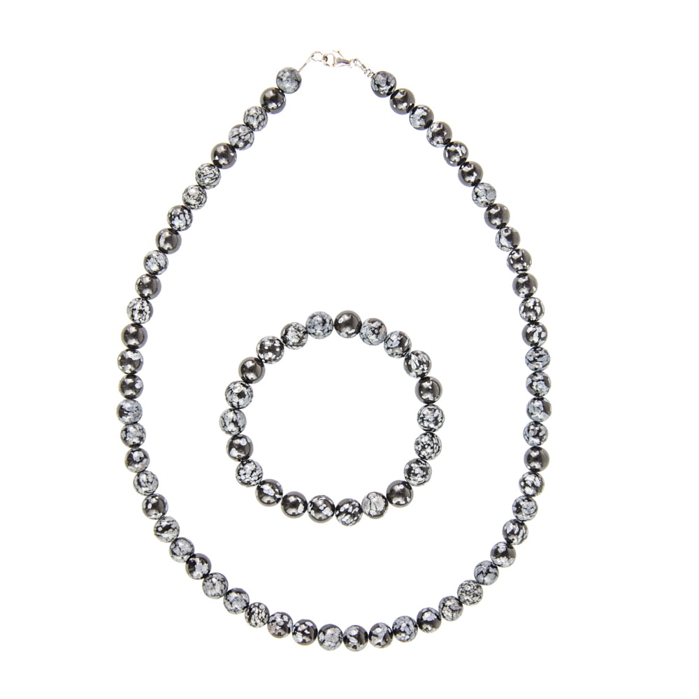 Parure composée du bracelet et du collier en obsidienne flocon de neige en pierres boules de 8mm