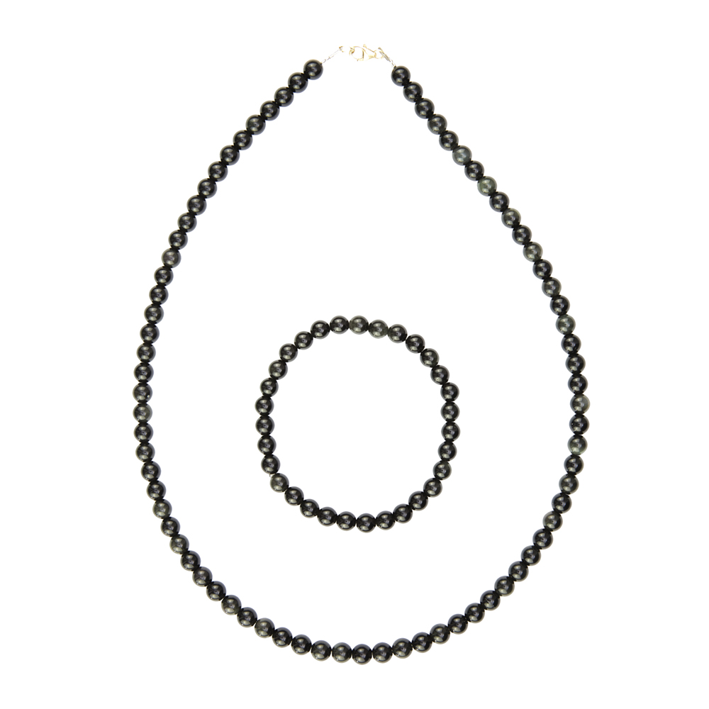 Parure composée du bracelet et du collier en obsidienne noire en pierres boules de 6mm