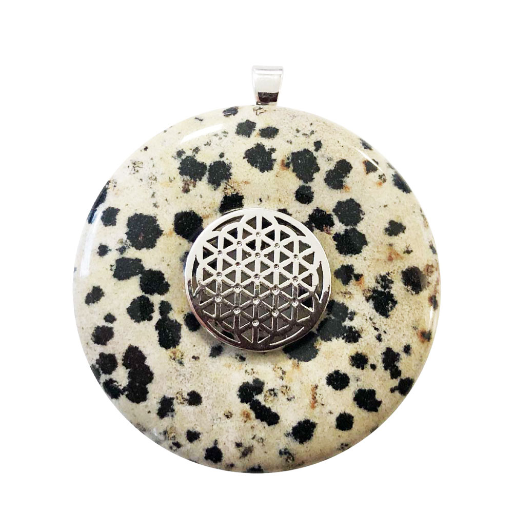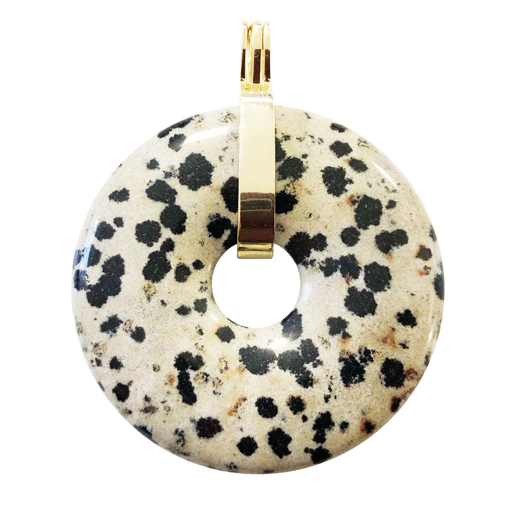 - Le pendentif jaspe dalmatien donut aide à calmer le stress. Ce pendentif sera aussi votre meilleur allié pour vous protéger des énergies nocives, favoriser la bonne humeur et remonter vos vibrations quand vous traversez un moment difficile. Si vous avez une âme d’artiste, le pendentif jaspe dalmatien donut vous aidera à faire éclore votre créativité.