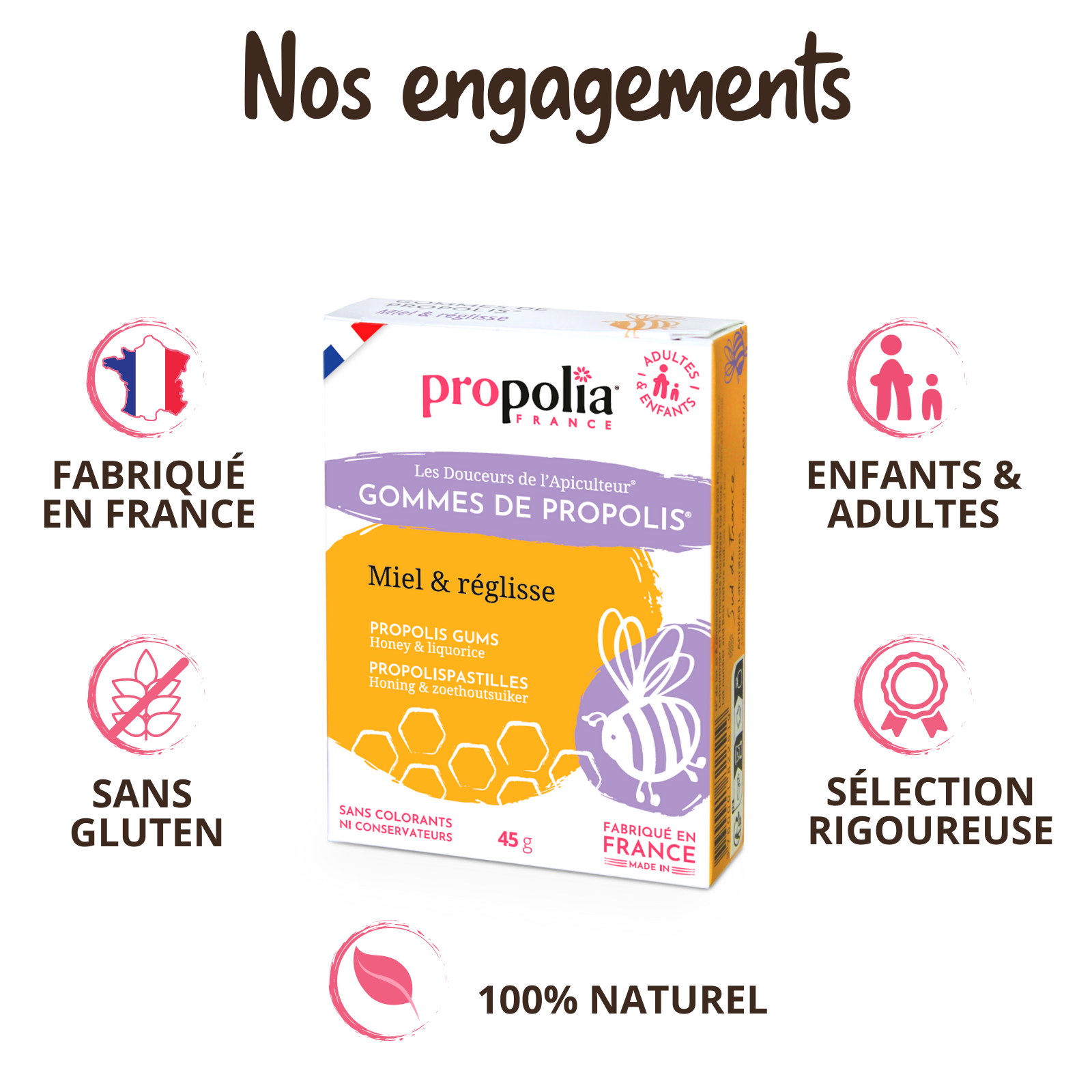 Gomme arabique (épaississant), Sucre roux pure canne, Miel 17%, Extrait de Propolis européenne purifiée 6%, Arômes naturels : Suc de Réglisse.