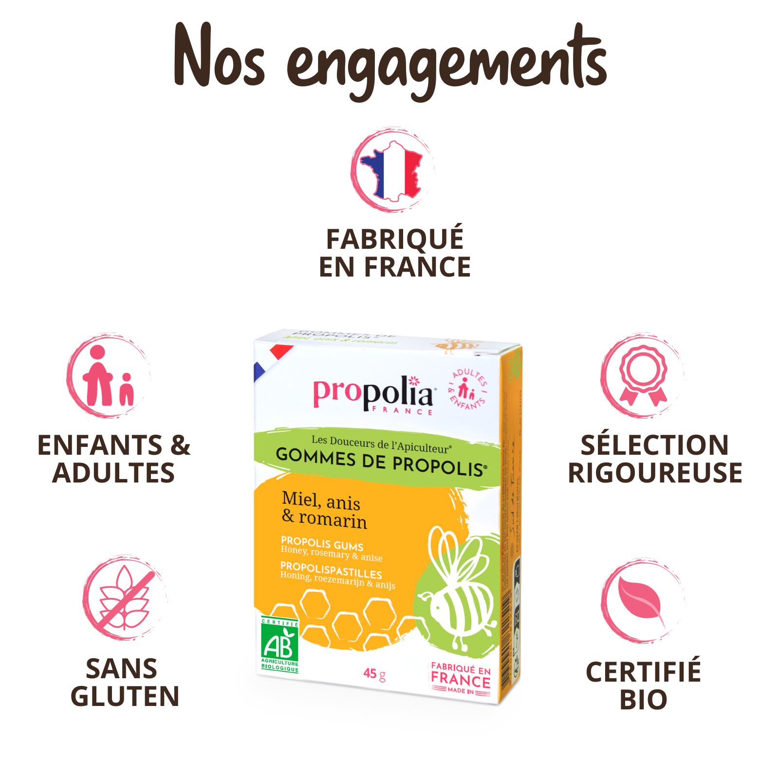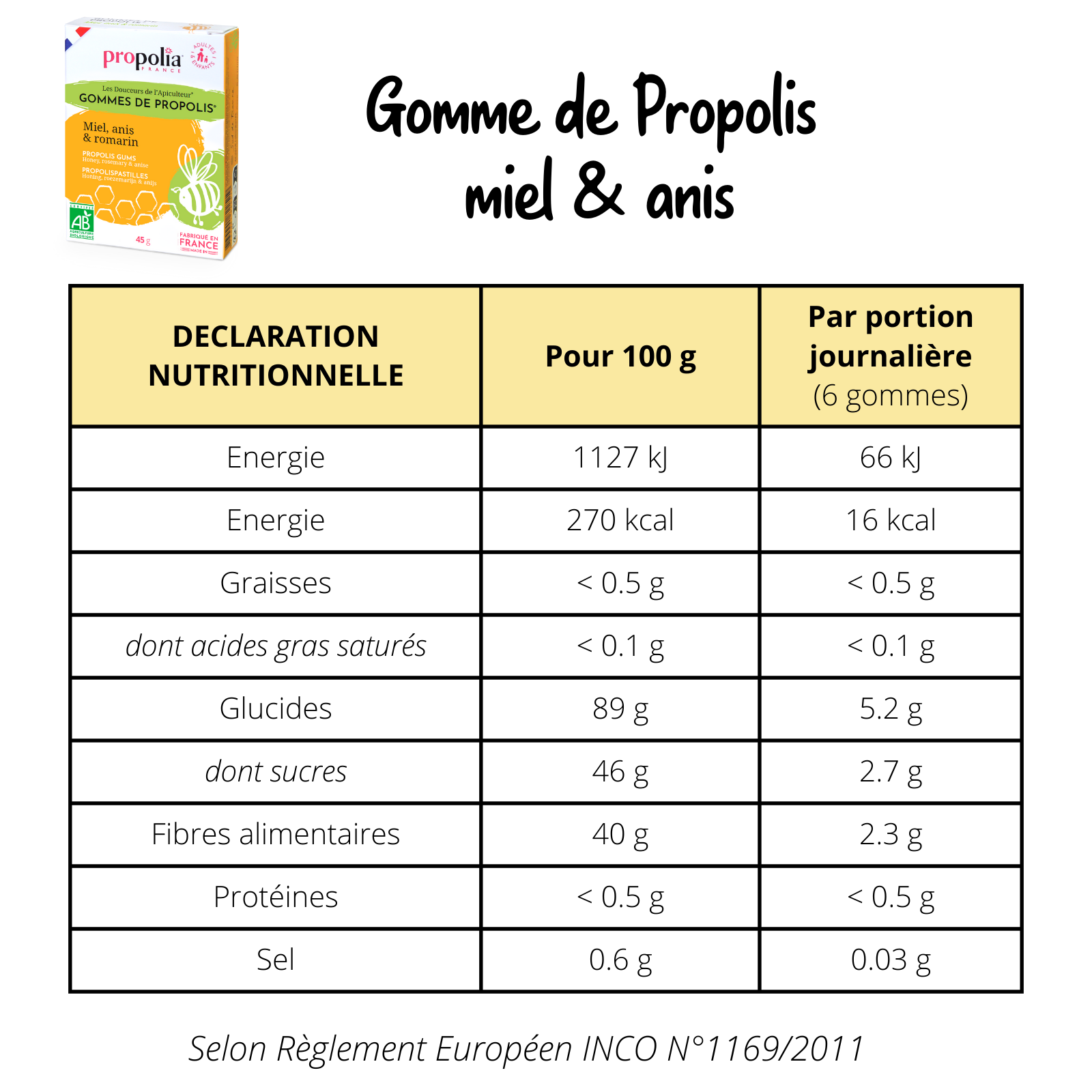 Gomme arabique*(épaississant), Sucre roux pure canne*, Miel* 18%, Extrait de Propolis purifiée* 3% origine Europe et Amérique de Sud, Huile essentielle de Romarin* (Rosmarinus officinalis), Arômes naturels d’Anethol et de Citron.