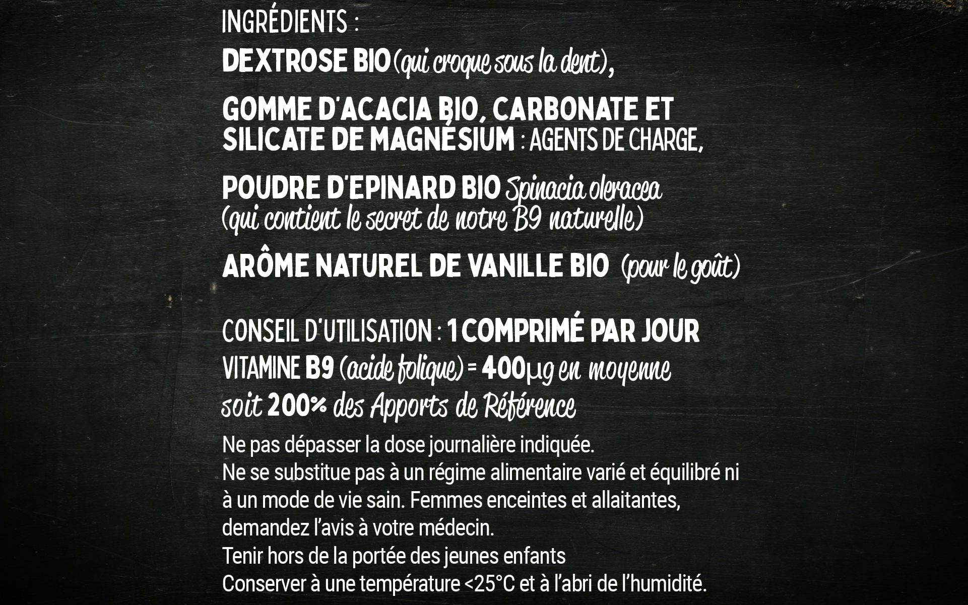 Chaque comprimé apporte 400µg d’acide folique soit environ 200% des apports de référence.