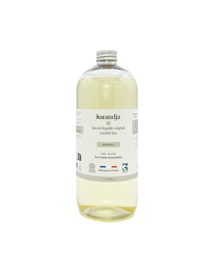 Savon liquide végétal pur olive, certifiéBio, au parfum d’amande, végan. Fabrication artisanale dans nos ateliers au cœur des Alpes.