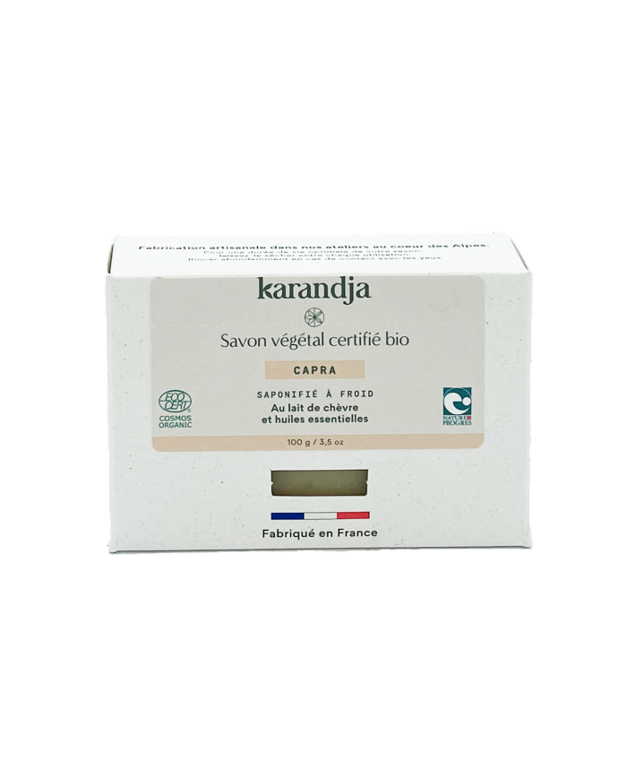 Savon solide, certifiéBio, saponifié à froid, surgras 5 %, au lait de Chèvre bio et aux huiles essentielles. Fabrication artisanale dans nos ateliers au cœur des Alpes.