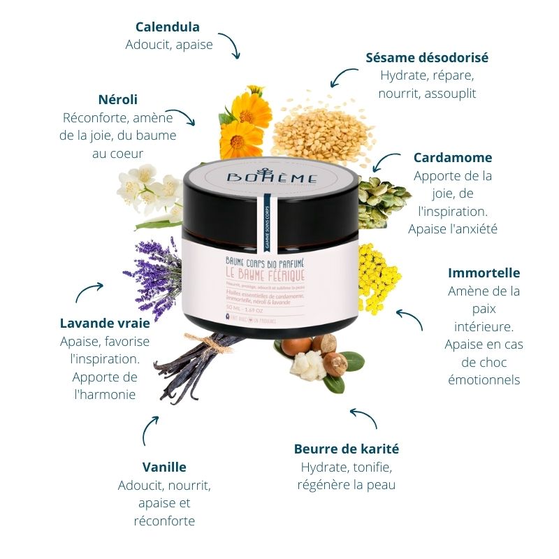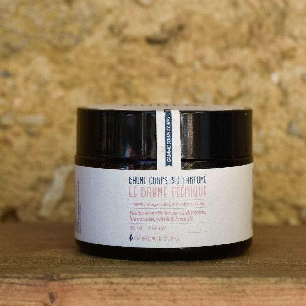 Découvrez l’harmonie parfaite entre soin et parfum avec notre Baume Bio Parfumé “Le baume féérique” pour le corps.