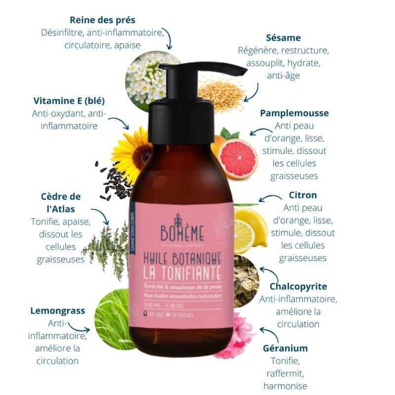 L’huile pour le corps “La Tonifiante” est idéale pour tonifier et assouplir la peau lors de variations de poids, de grossesse afin de raffermir et de réparer l’épiderme.