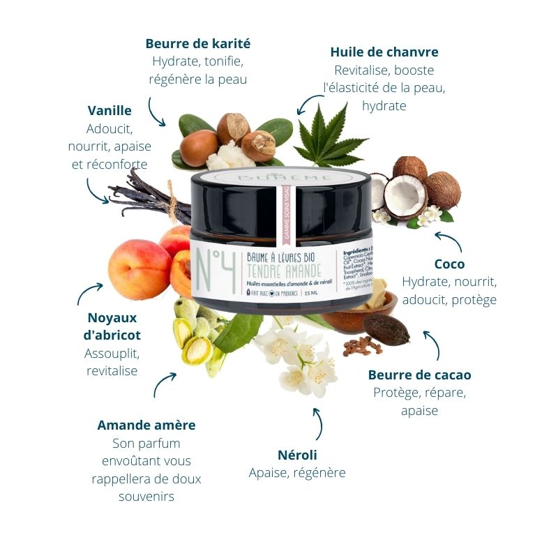 Plongez dans un paradis d’apaisement et de douceur avec le Baume à Lèvres Bio n°4 Tendre Amande.