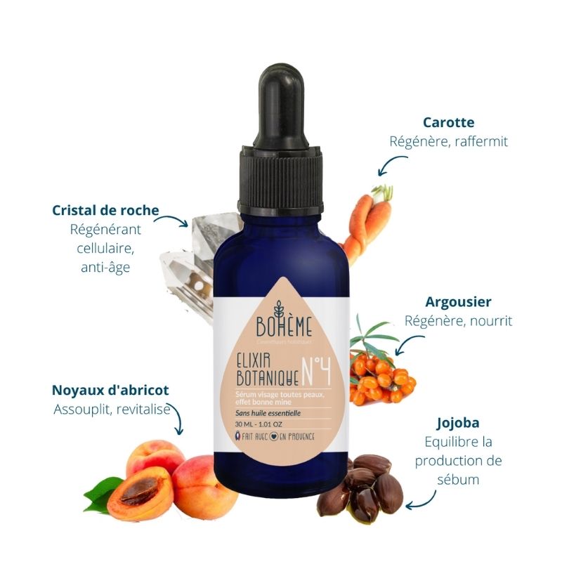 L’Elixir Botanique n°4 est élaboré avec des huiles végétales bio d’argousier, de jojoba, de carotte et d’abricot, des trésors de la nature chargés d’antioxydants et de vitamines essentielles.