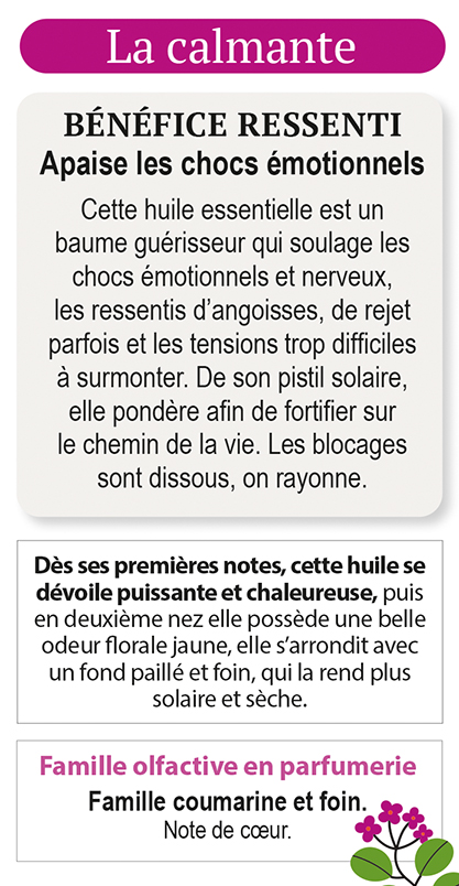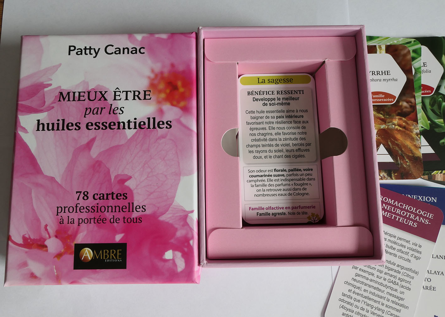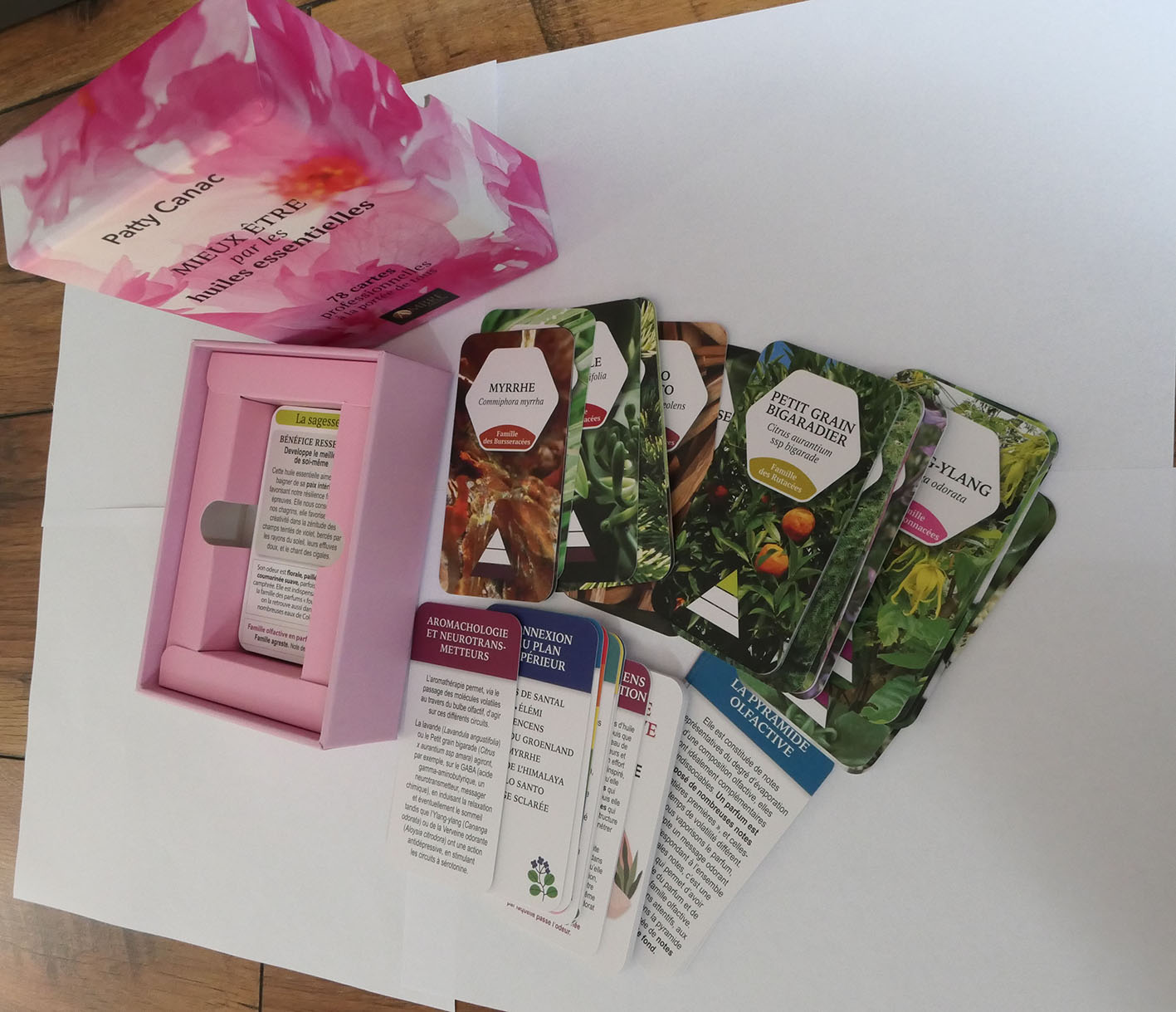 – 55 cartes d’huiles essentielles détaillant leur nom latin, leur famille botanique, le bénéfice ressenti, sa tenue dans une pyramide olfactive, sa famille olfactive afin de pouvoir les marier par affinités.