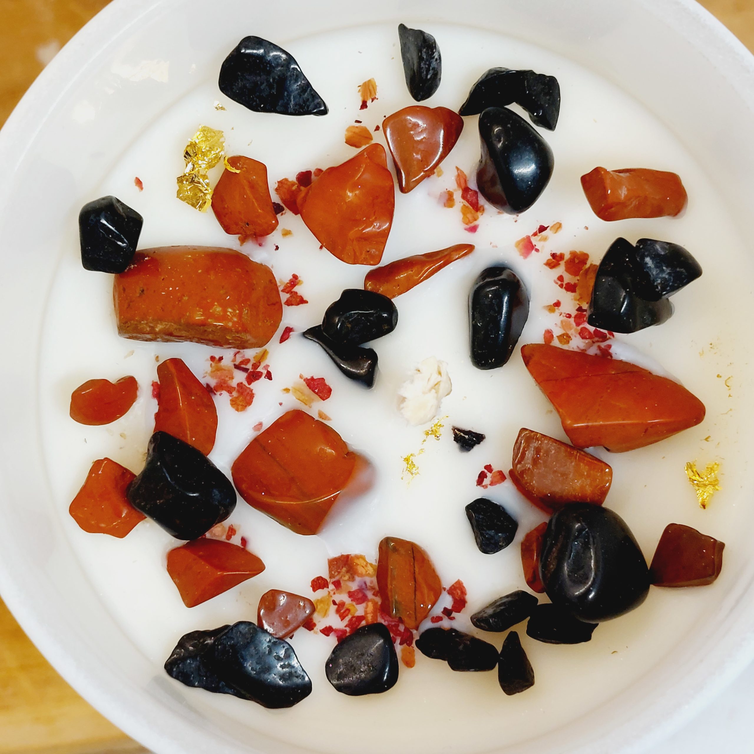 - Ajouts pour bienfaits : Plantes, résines naturelles, feuille d’or 24 carats, pierres semi-précieuses.