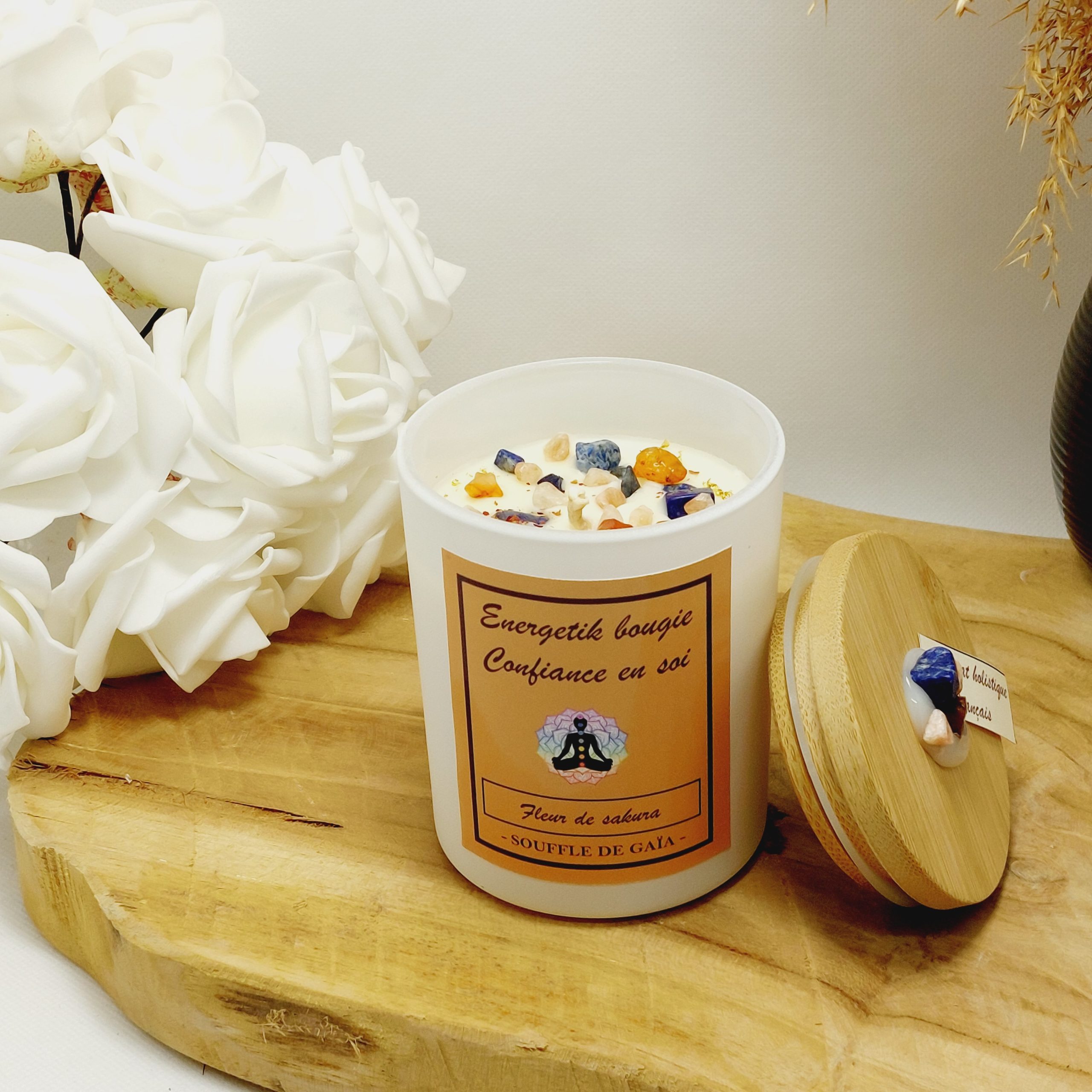 Bougie d’intention programmée énergétiquement avec ses pierres de lithothérapie : Confiance en soi.
