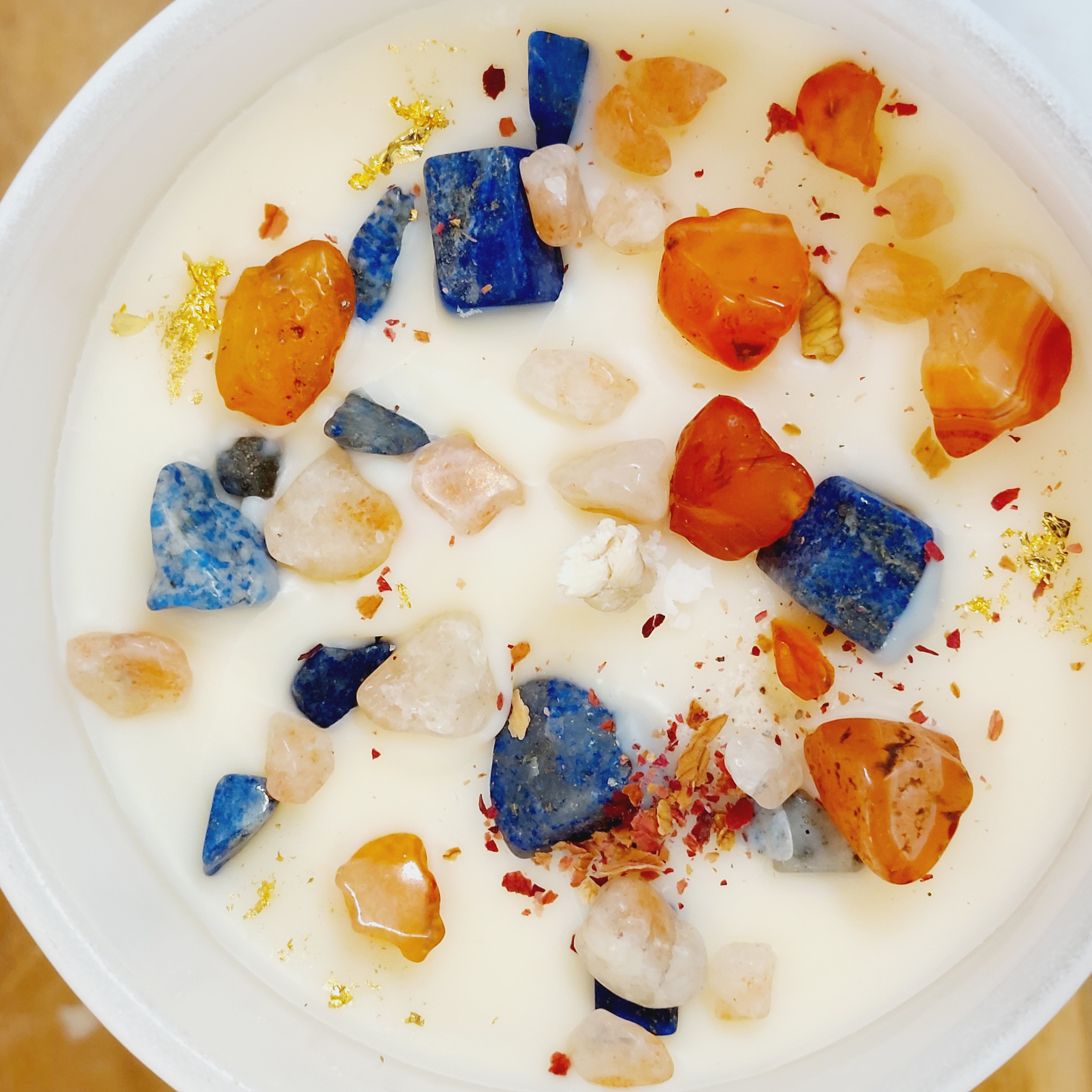 - Pierres de lithothérapie de la bougie confiance en soi : Cornaline rouge, Lapis-lazuli et Pierre de soleil.