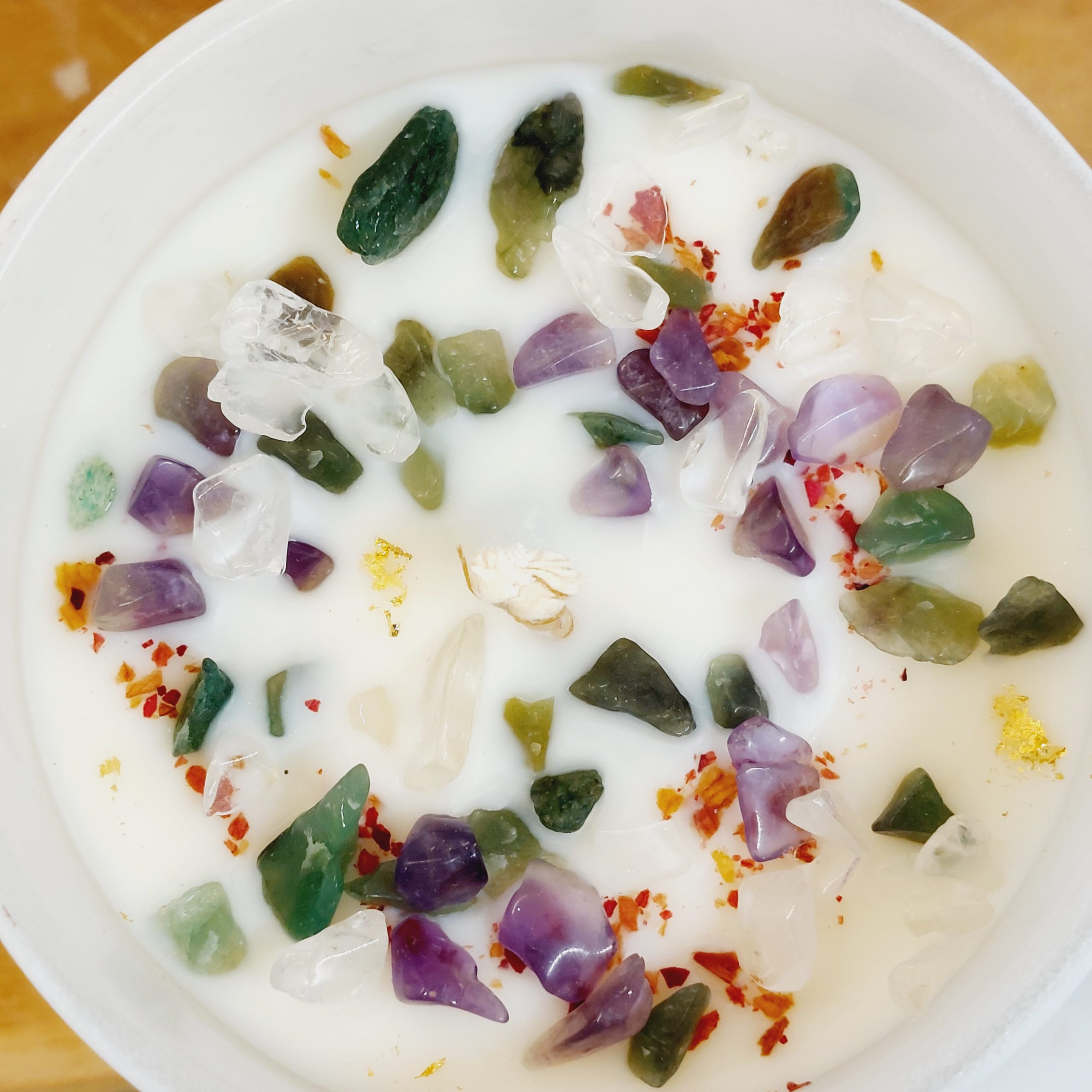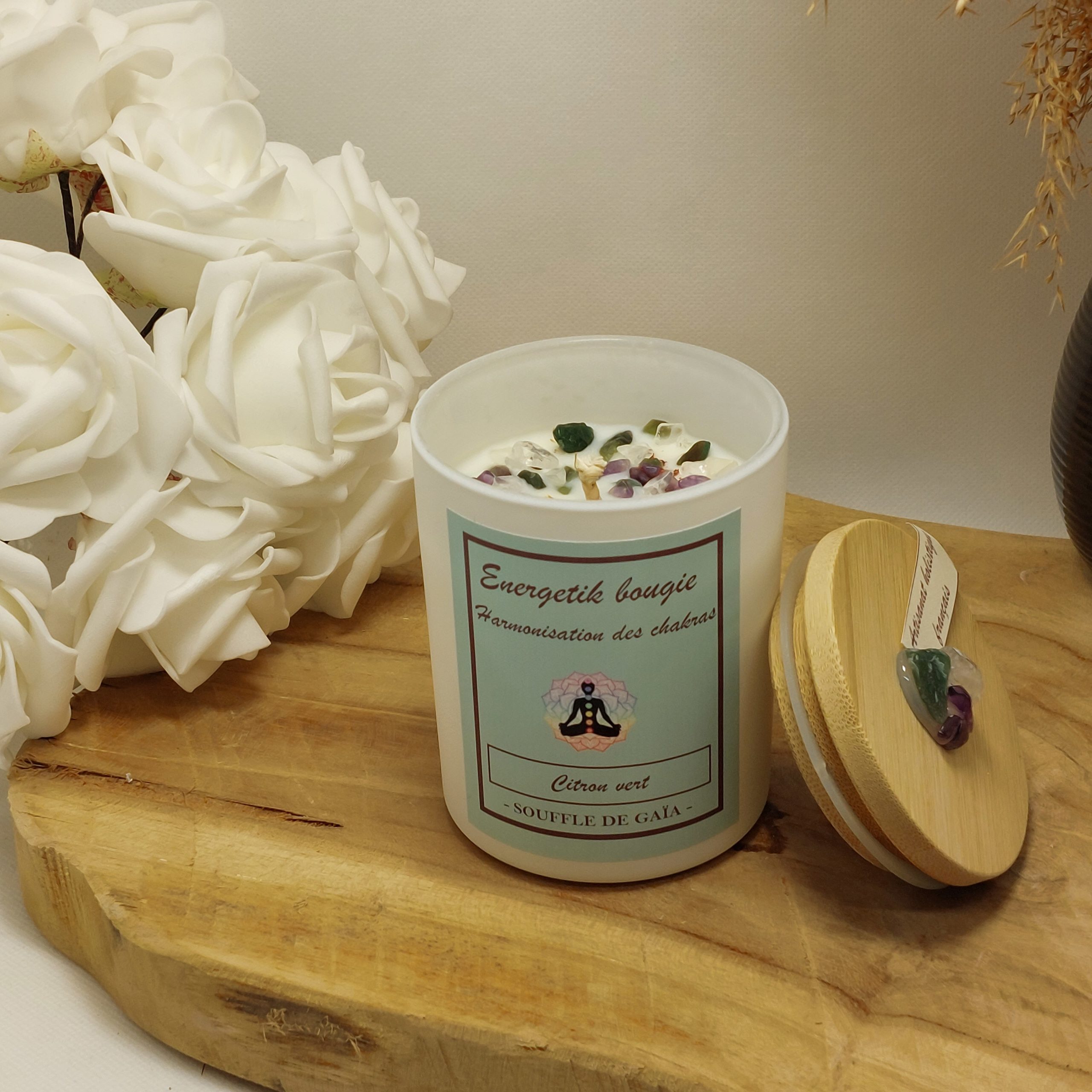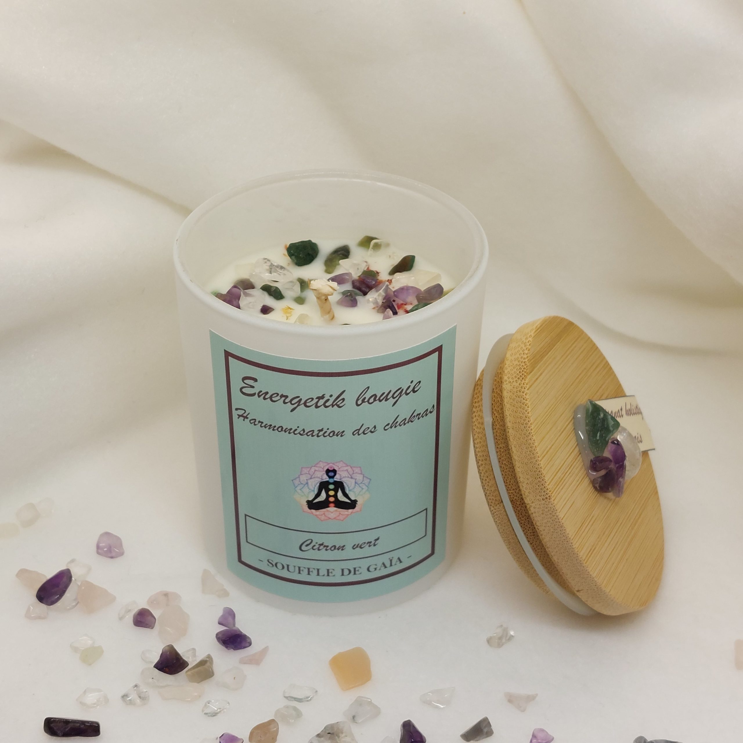 Bougie d’intention programmée énergétiquement avec ses pierres de lithothérapie : Harmonisation des chakras.