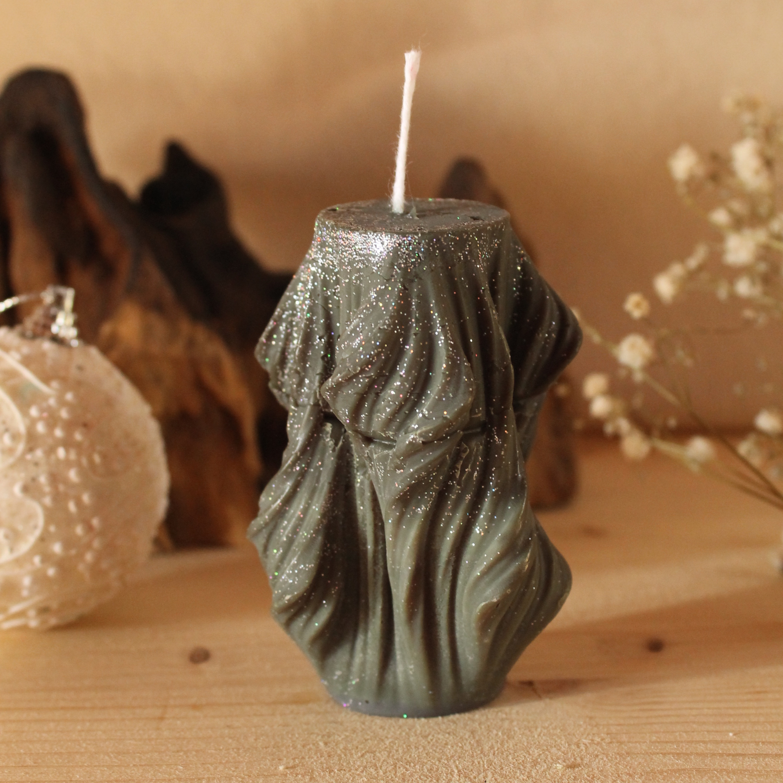 Complétez votre décoration avec une bougie parfumée drapée petit format et l’un de nos support en résine éco-responsable.