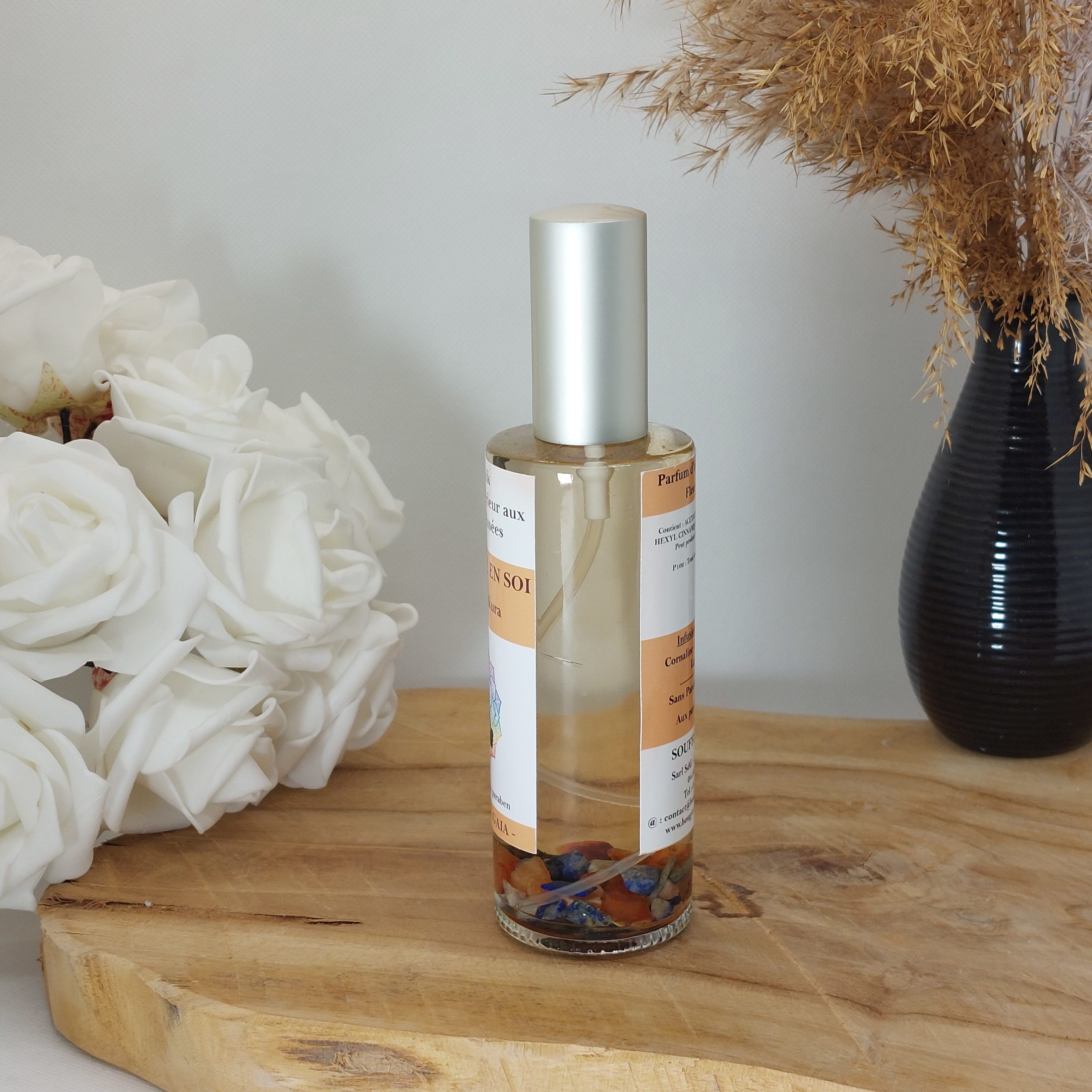 - Composition : Base végétale sans alcool, Parfums de Grasse de haute qualité ( sans CMR, sans Phtalates), Cristaux.