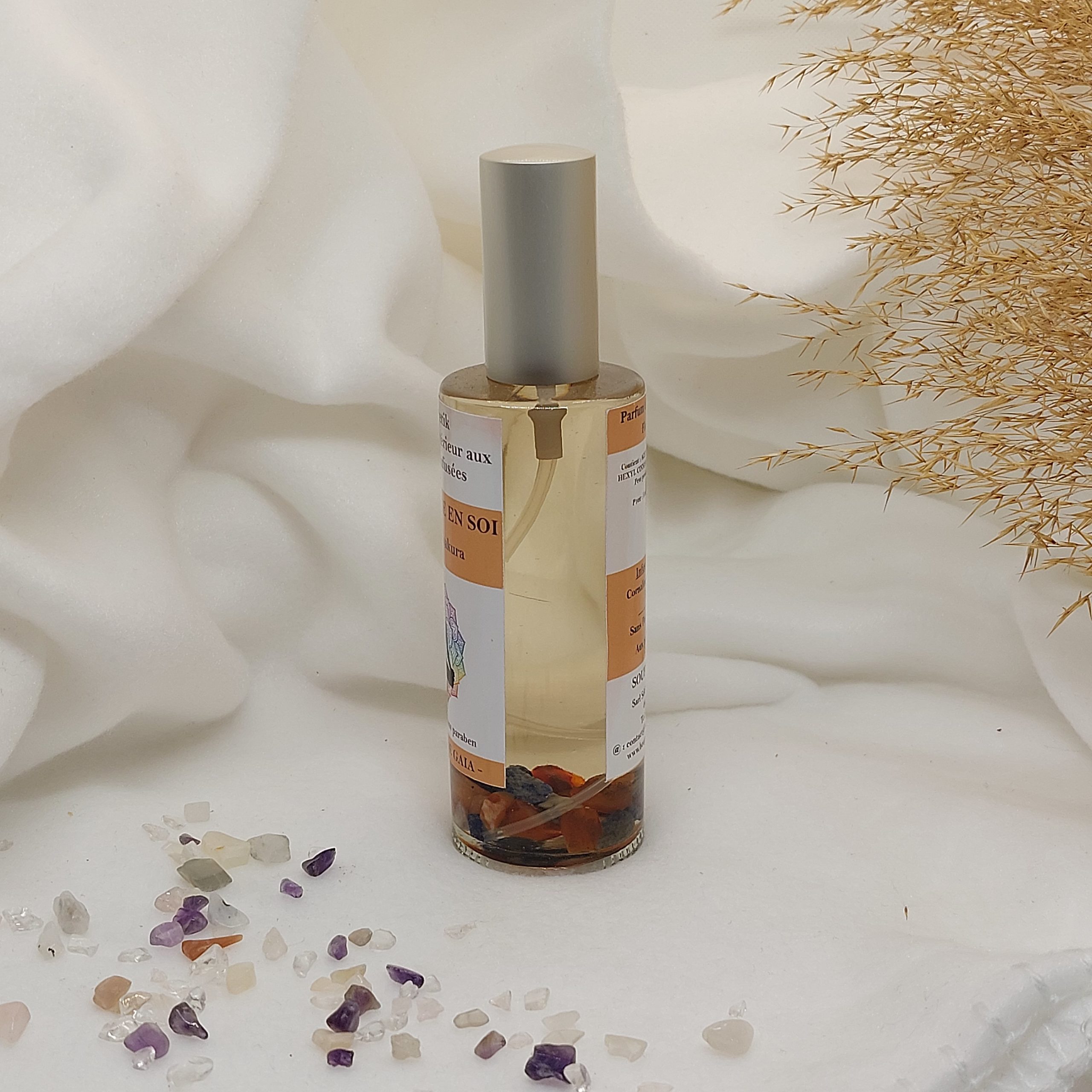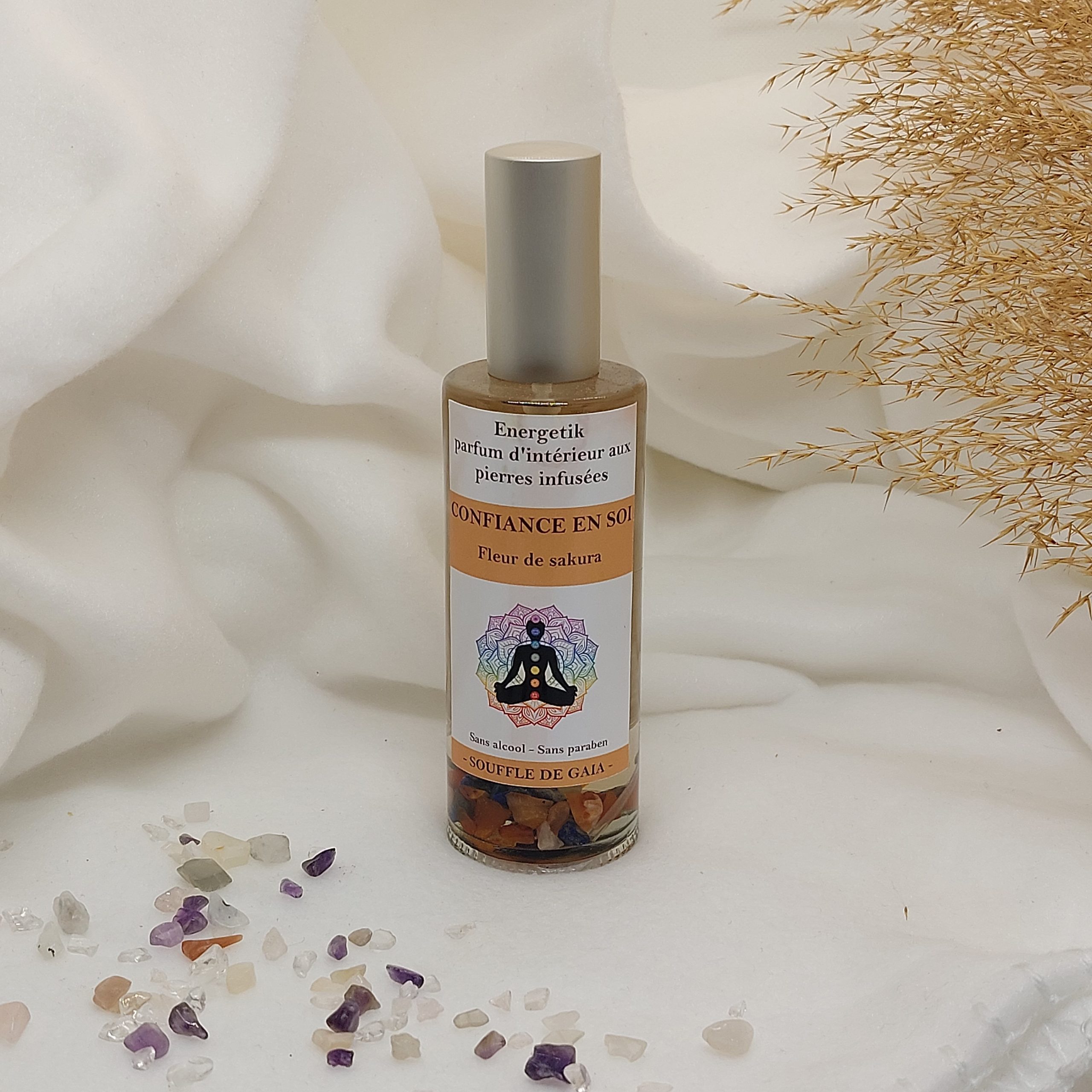 Parfum d’intérieur en spray programmé énergétiquement avec ses pierres de lithothérapie : Confiance en soi.