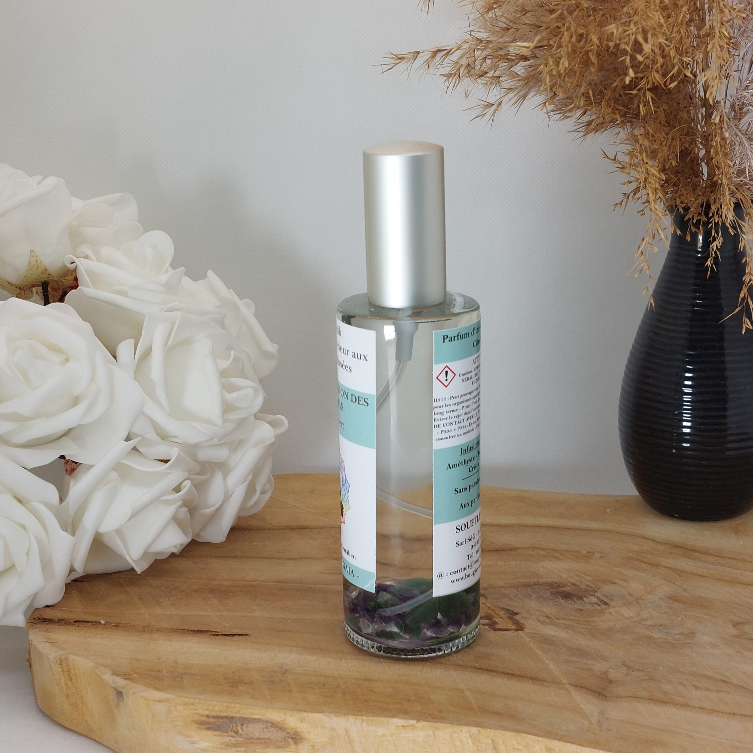 - Composition : Base végétale sans alcool, Parfums de Grasse de haute qualité ( sans CMR, sans Phtalates), Cristaux.