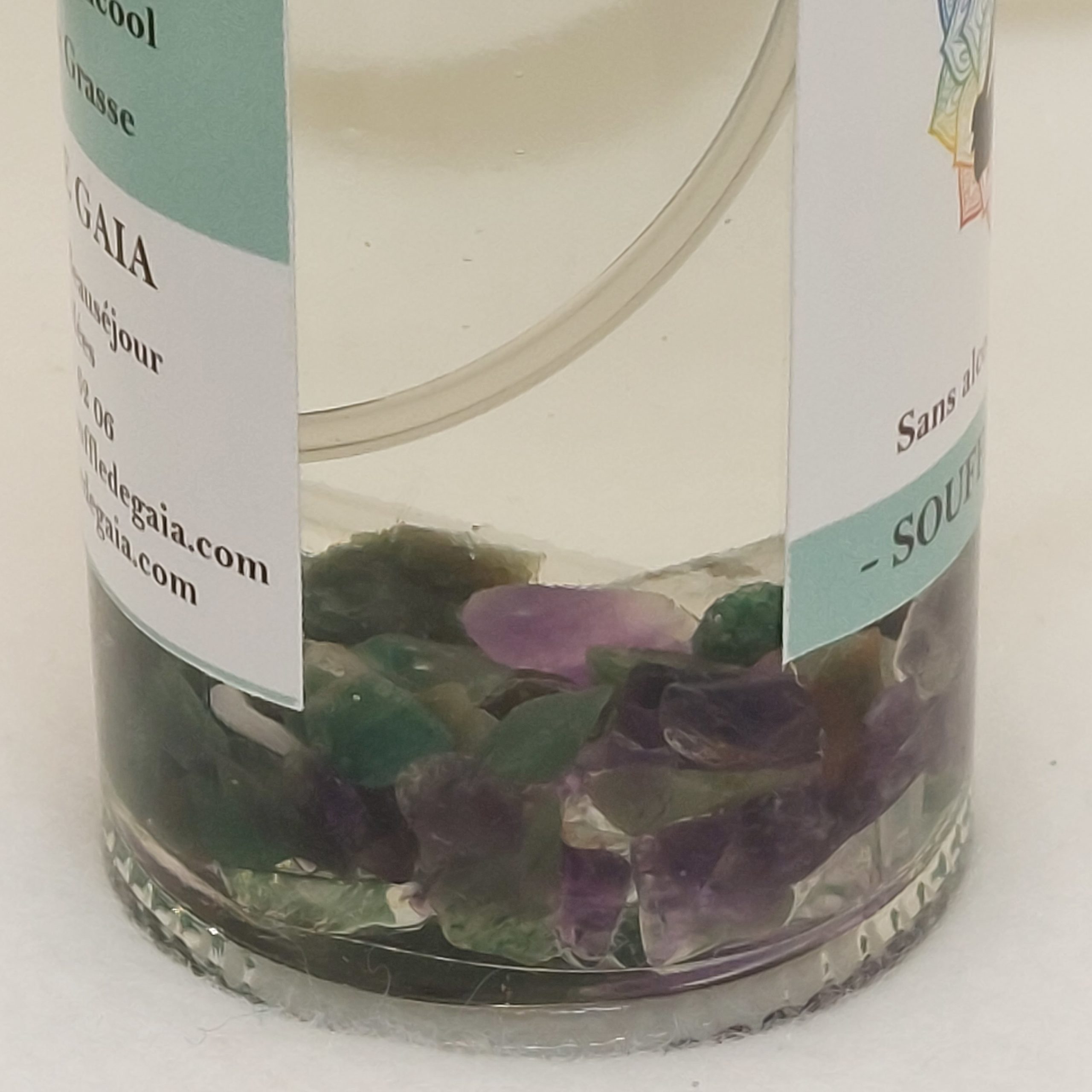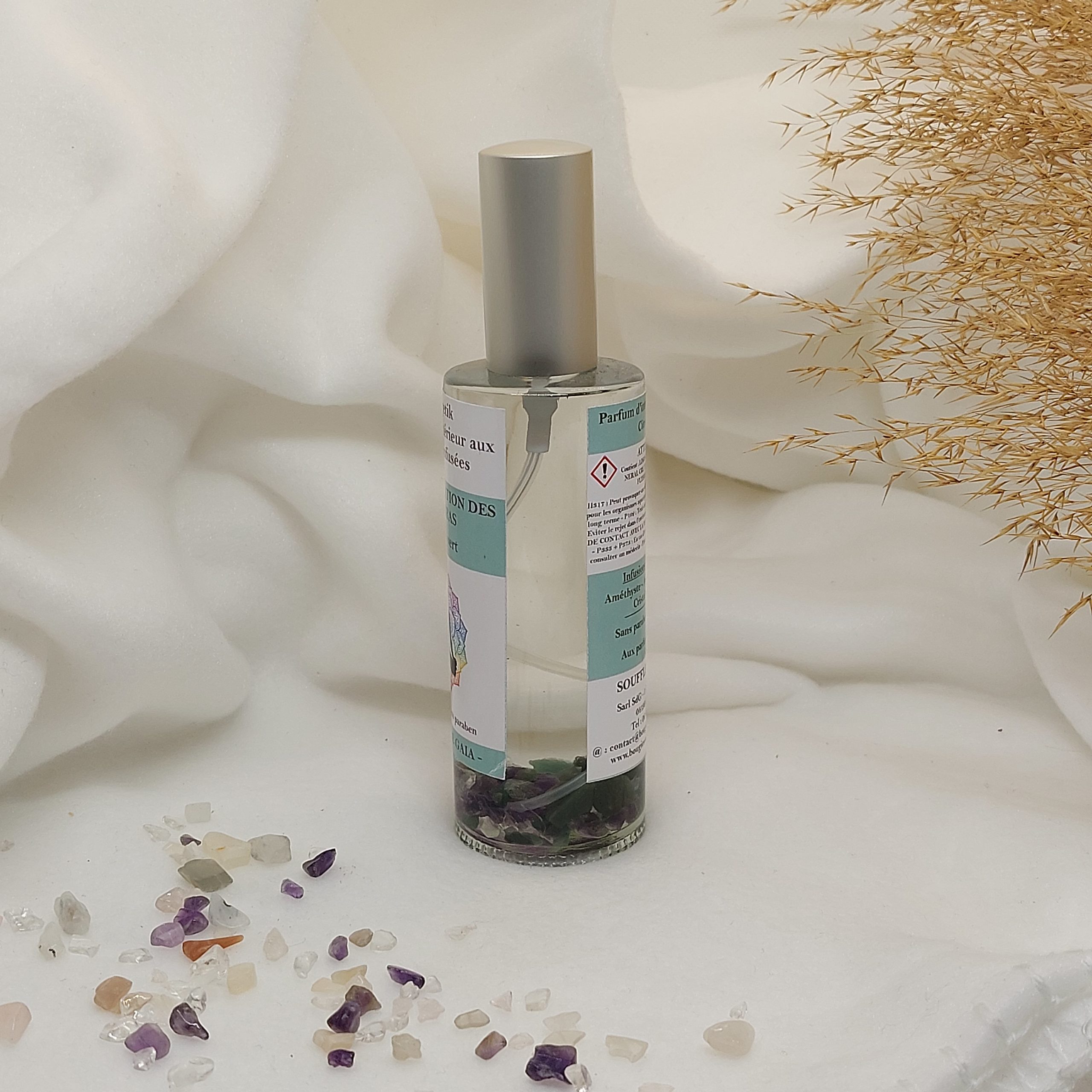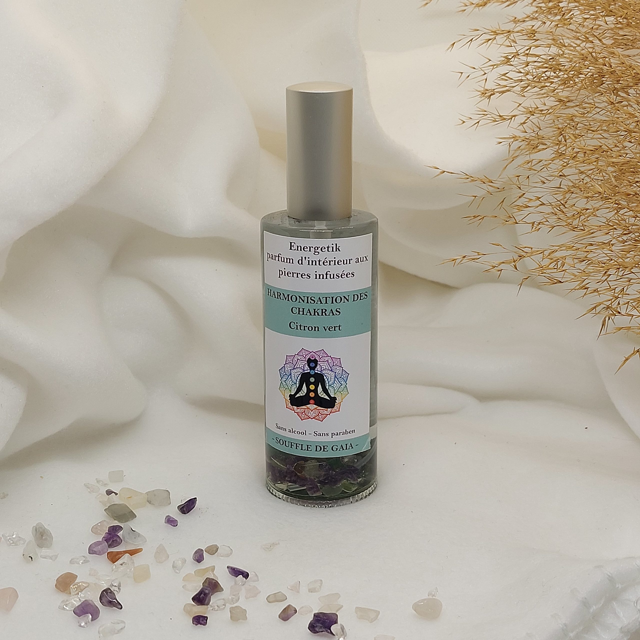 Parfum d’intérieur en spray programmé énergétiquement avec ses pierres de lithothérapie : harmonisation des chakras.
