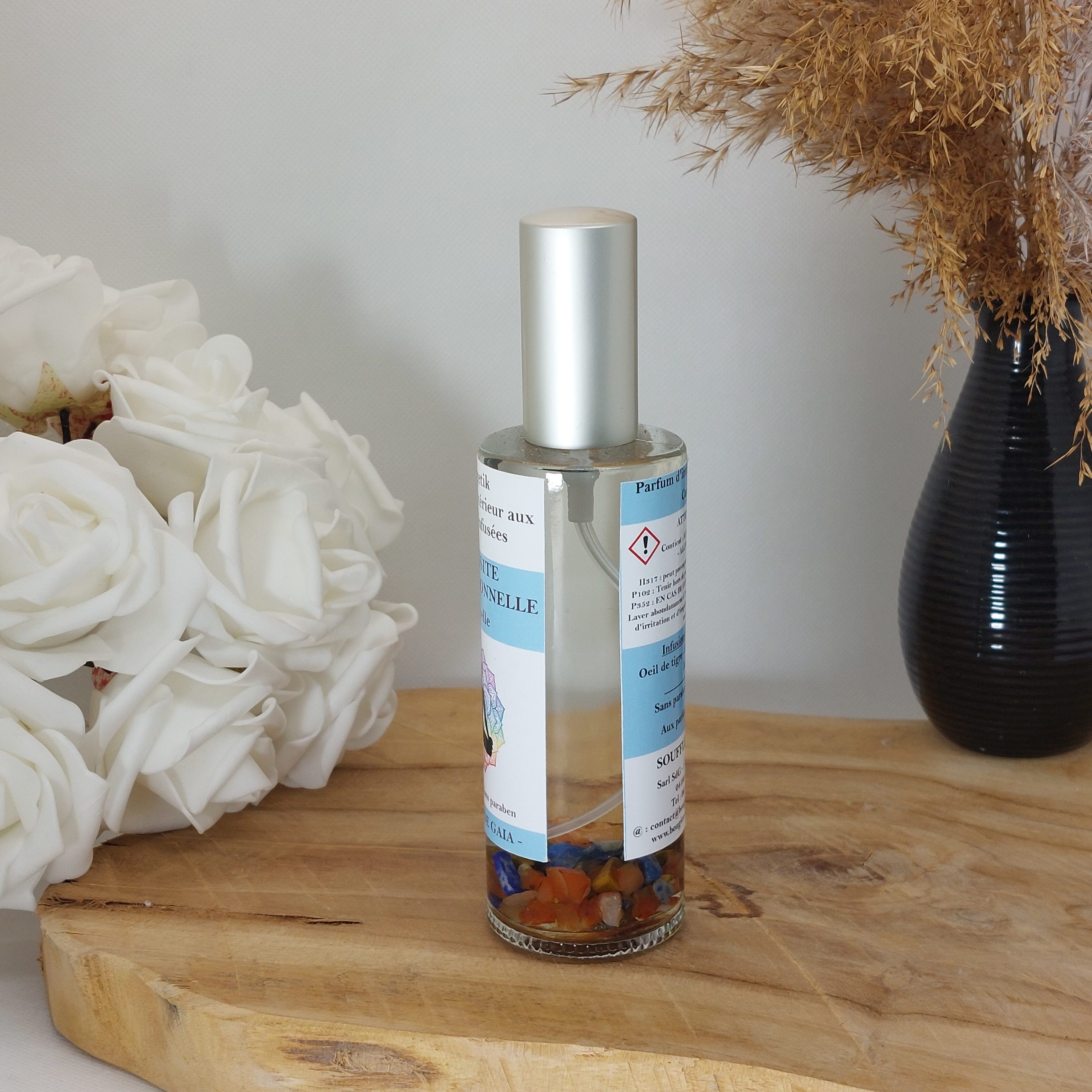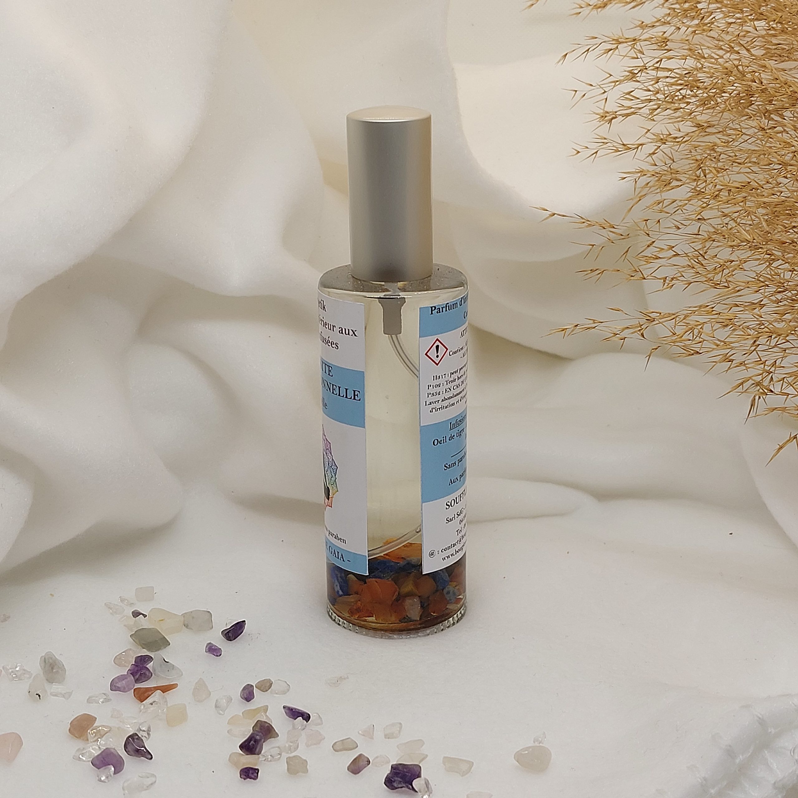 - Composition : Base végétale sans alcool, Parfums de Grasse de haute qualité ( sans CMR, sans Phtalates), Cristaux.