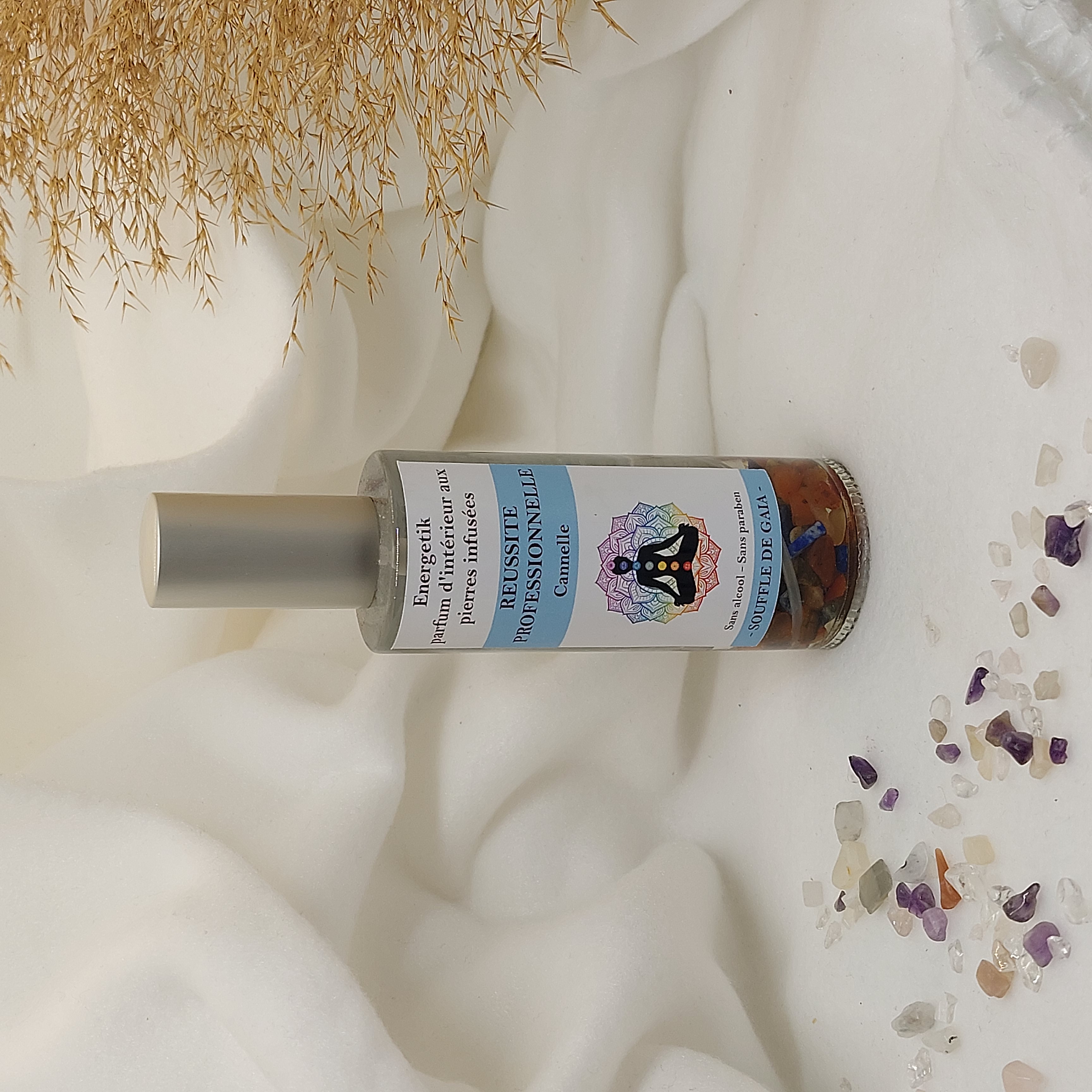 Parfum d’intérieur en spray programmé énergétiquement avec ses pierres de lithothérapie : réussite professionnelle.