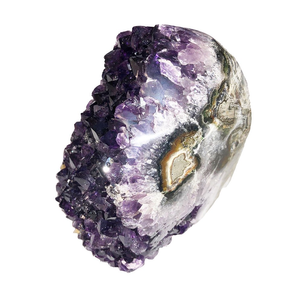 Une druse d’améthyste se compose de nombreux cristaux. Elle possède toutes les qualités du cristal qui la composent. Ils diffusent en effet leur énergie partout autour d’eux, puisqu’orientés dans toutes les directions. Cette pierre possède les propriétés apaisantes et calmantes de l’améthyste. La forme de cette pierre peut être ovale, pointue, ou indéterminée. Certaines sont même en forme de cœur ! Sa couleur peut varier du violet foncé au violet clair, voire transparent. Certains modèles de la druse possèdent aussi des inclusions de calcite. Elle se distingue de la géode : celle-ci est plutôt ronde, avec une cavité à l’intérieur. Quant à la druse, elle est plutôt plate ou légèrement arrondie, avec une façade entièrement recouverte de cristaux.