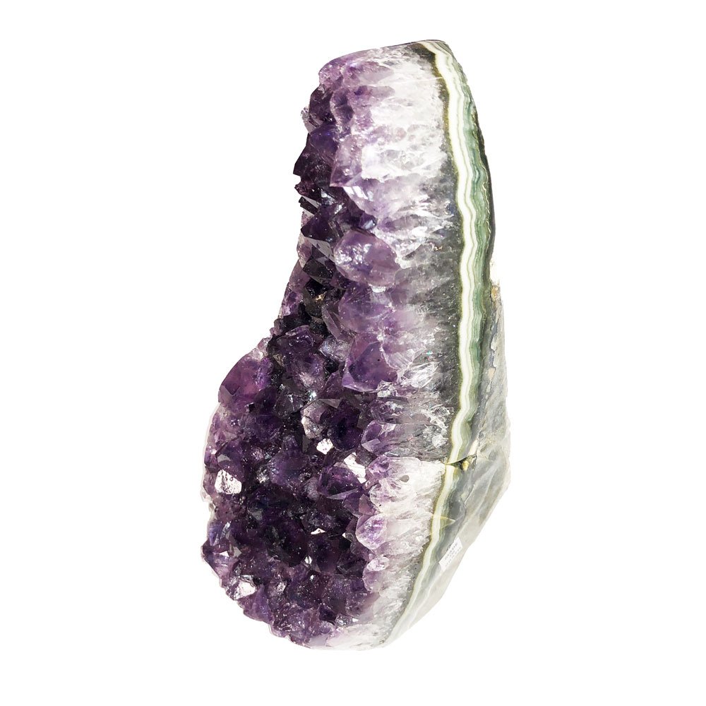 Il existe plusieurs légendes sur l’améthyste, notamment celle de puissant antidote contre l’ivresse. Dans la mythologie grecque, une nymphe nommée Amethystos, désirant rester chaste, malgré les assauts de Dionysos (dieu du vin) se fit transformer en roche blanche pour lui fuir. Dionysos, frustré, versa du vin sur la roche blanche, la teintant alors de pourpre. À noter que cette pierre était la pierre préférée de la Reine Margot qui adorait se parer de bijoux en améthyste. Elle avait d’ailleurs une résidence à proximité d’un gisement fructueux en améthyste. L’améthyste est le symbole de la sagesse et de la sainteté. D’ailleurs, la pierre de l’anneau épiscopal est une améthyste depuis le Moyen-Âge. Les chevaliers qui partaient en croisade portaient une améthyste pour les protéger. De nos jours, la druse d’améthyste est parfaite pour recharger vos cristaux, quelle que soit leur matière. Il suffit de les poser dessus pendant quelques minutes, voire quelques heures. Un petit conseil : il est essentiel de purifier vos cristaux avant de les poser sur la druse.