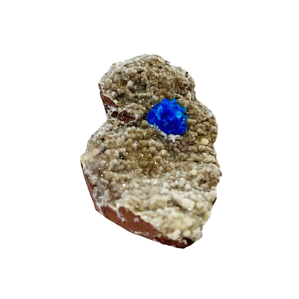 La cavansite d’Inde est une pierre hors du commun. Fragile, de dureté 3-4 sur l’échelle de Mohs, elle est de grande valeur car elle est rare et difficile à extraire. Effectivement, on ne la trouve que dans de petites cavités de basaltes et de tufs que l’on appelle vacuoles. Ses principaux gisements et plus beaux spécimens se trouvent en Inde mais on en trouve également au Pakistan et en Afghanistan. La pierre de cavansite a été découverte très tard, en 1960, par un couple de randonneurs aux Etats-Unis, plus précisément dans l’état de l’Oregon. Ce qui la rend si particulière, c’est sa superbe couleur bleue turquoise qui vient du vanadium qui la compose. D’ailleurs, concernant sa composition, elle est facile a retenir : calcium vanadium et silicium. Elle fait partie du sous-groupe des phyllosilicates, du groupe des silicates et est souvent associée à la pentagonite car elles partagent la même formule chimique. Pour différencier les deux, il suffit de regarder la cristallisation qui est différente de l’une à l’autre. On dira donc que la cavansite est un polymorphe de la pentagonite.