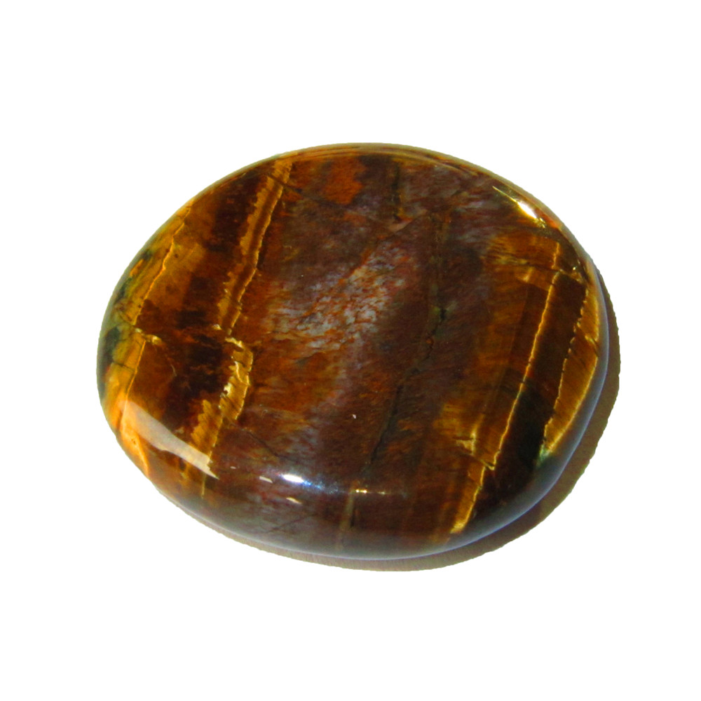 L’œil de tigre rougeâtre n’existe pas dans la nature. Si la pierre est trempée dans de l’alcool à brûler après la cuisson, une coloration violette se forme. Lorsque la pierre est bouillie dans de l’acide, la couleur brun doré s’estompe et l’œil de tigre devient gris. Dans cet état, il est proposé commercialement comme quartz œil de chat. L’oeil de tigre est opaque et a un éclat soyeux à gras. Sa coloration peut se déployer particulièrement bien à l’état taillé, la pierre rappelle alors l’œil d’un chat. Ce chatoiement, également appelé effet “œil de chat”, résulte de l’alignement parallèle des fibres de cristal individuelles. La dureté Mohs de l’oeil de tigre est de 6 à 7. L’œil de tigre est proposé dans une coupe lisse ainsi que dans une coupe en cabochon et transformé en amulettes ou en perles. Les artisans aiment également utiliser le minéral pour la production d’objets d’art.