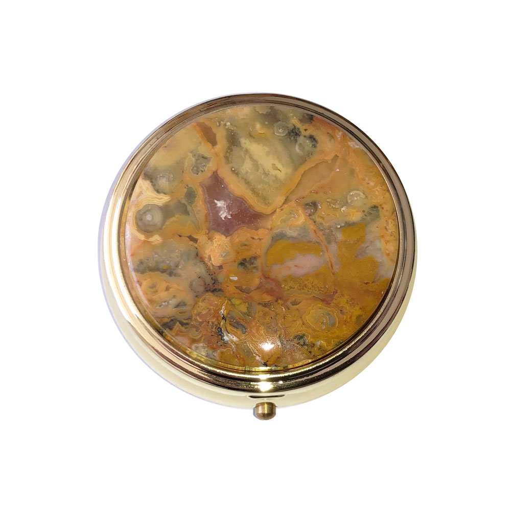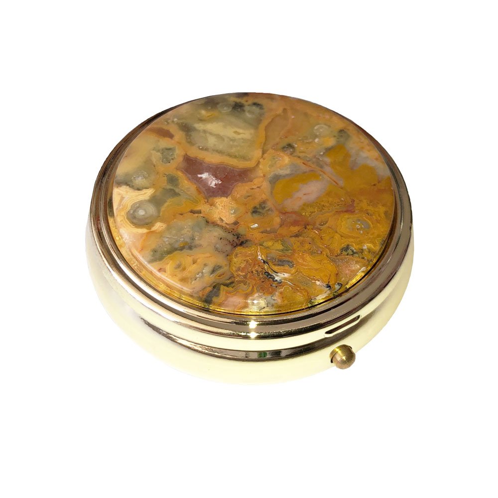 Cette petite boîte à pilules en agate crazy lace ronde, de 5 cm est un pilulier en métal, orné d’un disque en pierre. Indispensable pour stocker les pilules, en les maintenant bien hermétiques, propres et sèches, elle facilite la vie des personnes soumises à des prises régulières. Légère et résistante, la boîte à pilules en agate crazy lace se transporte partout et se glisse facilement dans un sac à main ou une poche. Dotée de petits compartiments distincts, organiser ses pilules par catégories ou heures de prise est facile et pratique. Son ouverture se fait par simple pression sur son bouton à l’avant; elle se referme délicatement en rabattant simplement le couvercle.